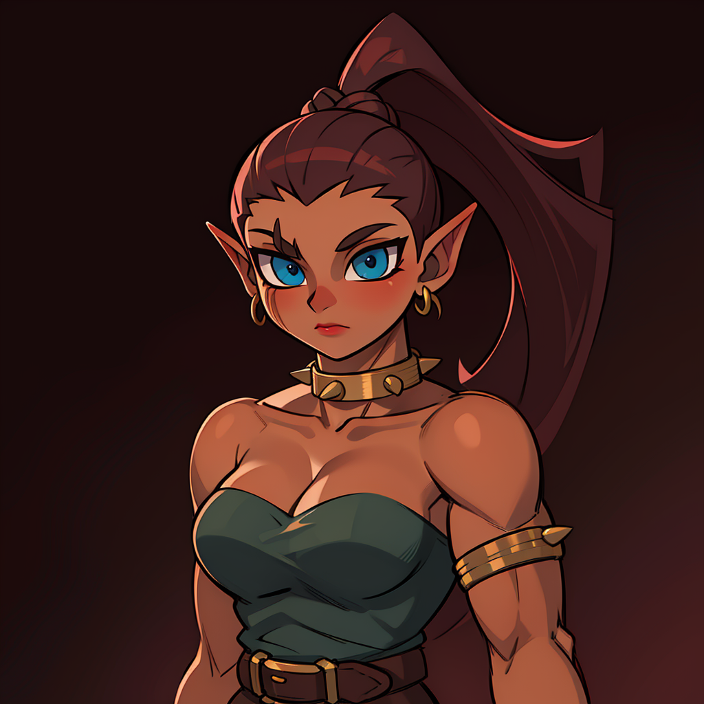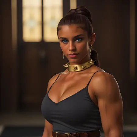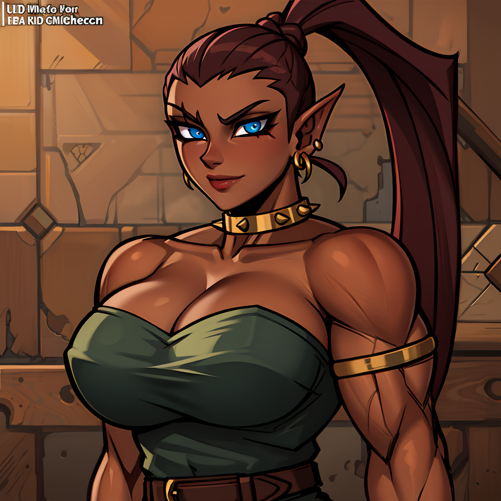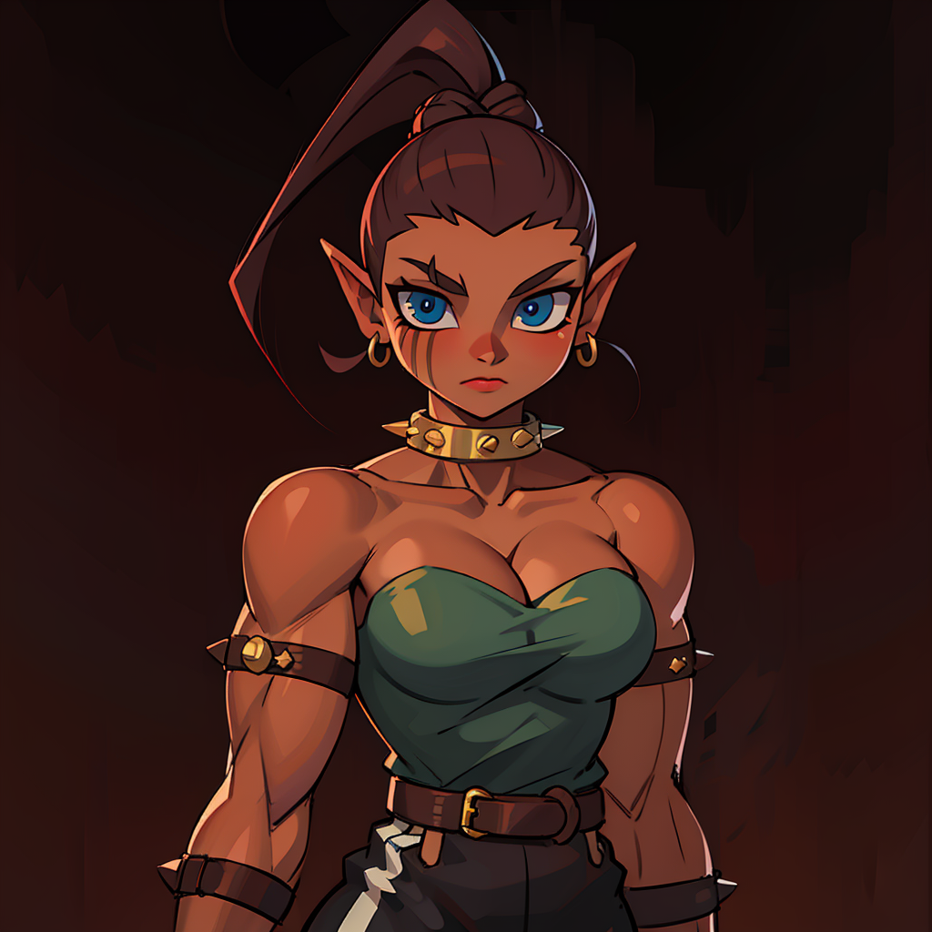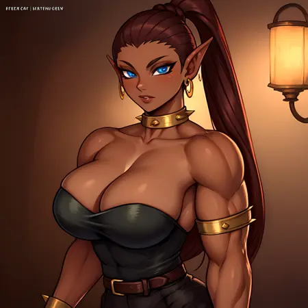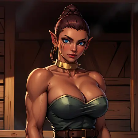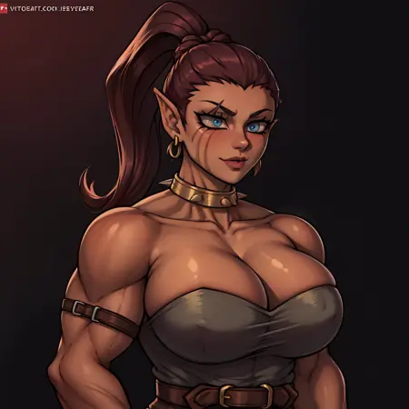 외모 태그: 파란 눈, 뾰족한 귀, 갈색 머리, 긴 머리, 토끼꼬리, 짙은 피부, 검은 탱크탑, 가슴 노출, 어깨 드러남, 스트랩 없음, 보석, 귀걸이, 팔찌, 치커, 근육질 여성, 벨트, 손가락 없음 장갑, 장갑, 얼굴에 흉터