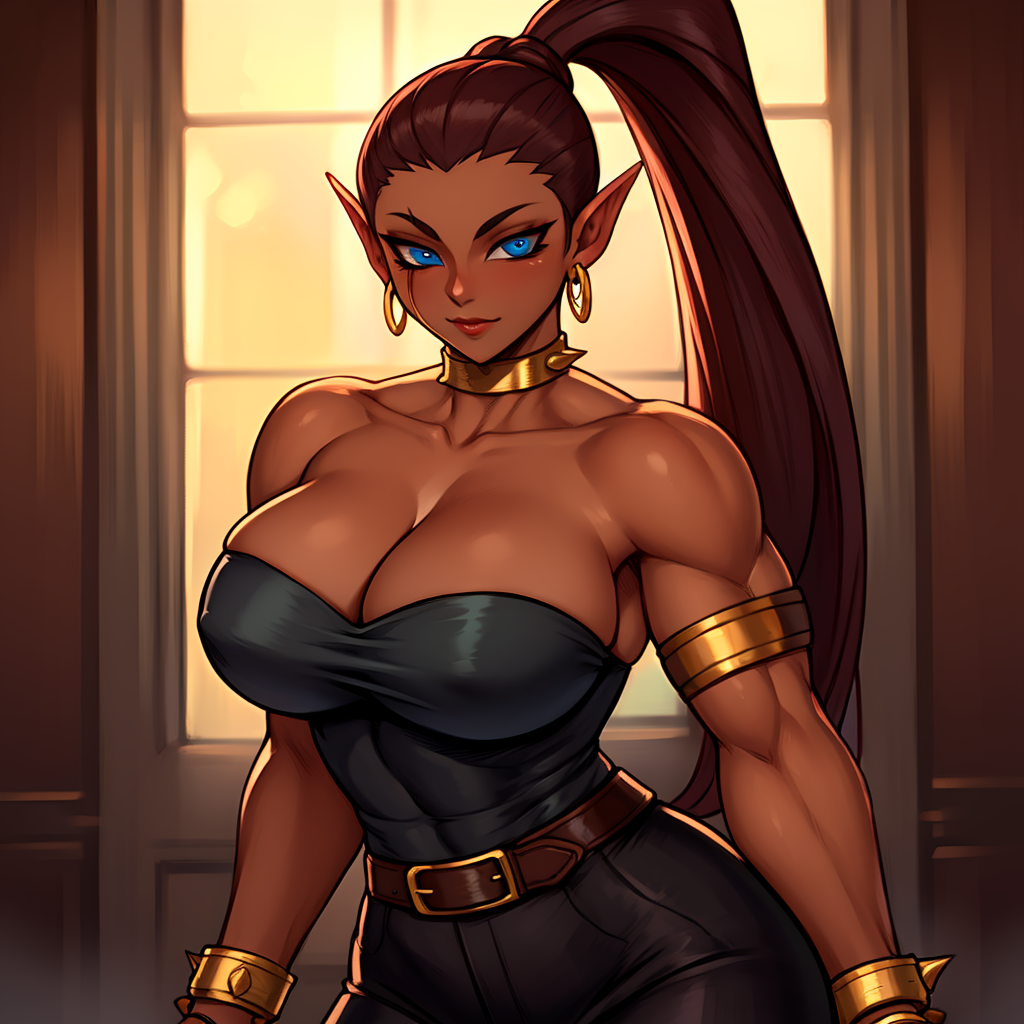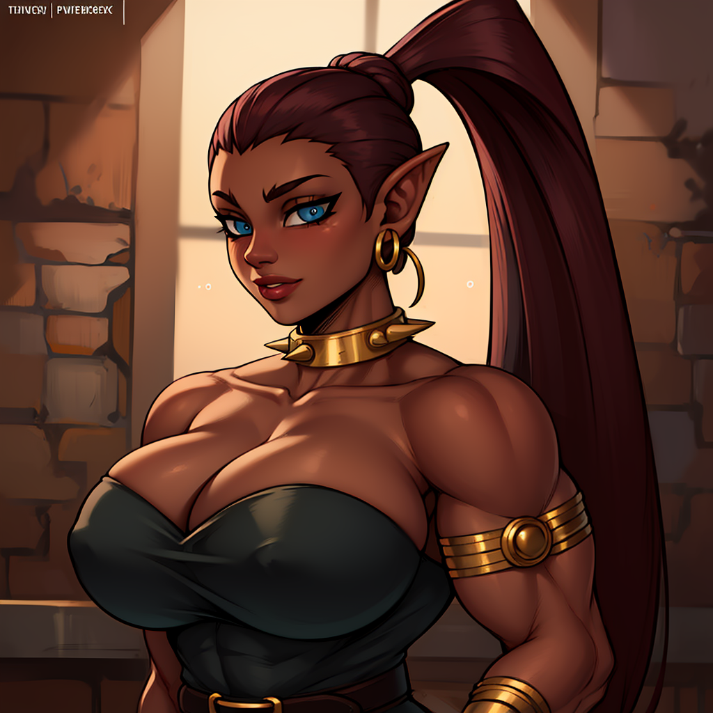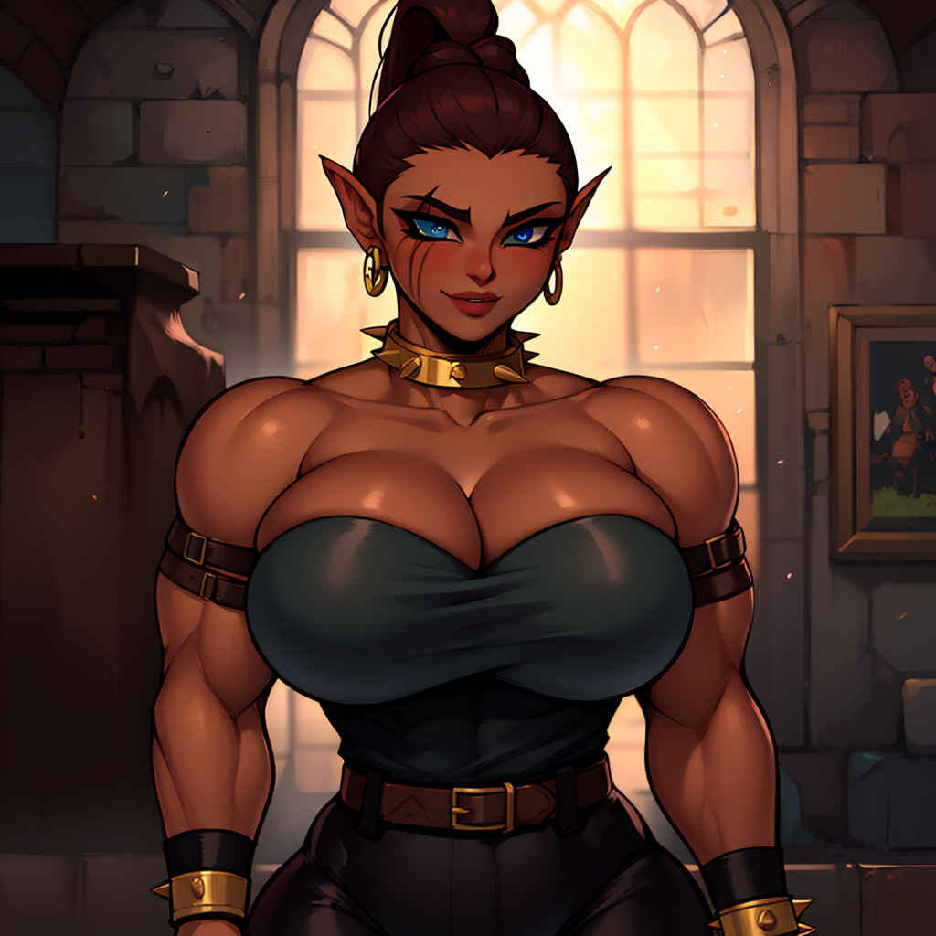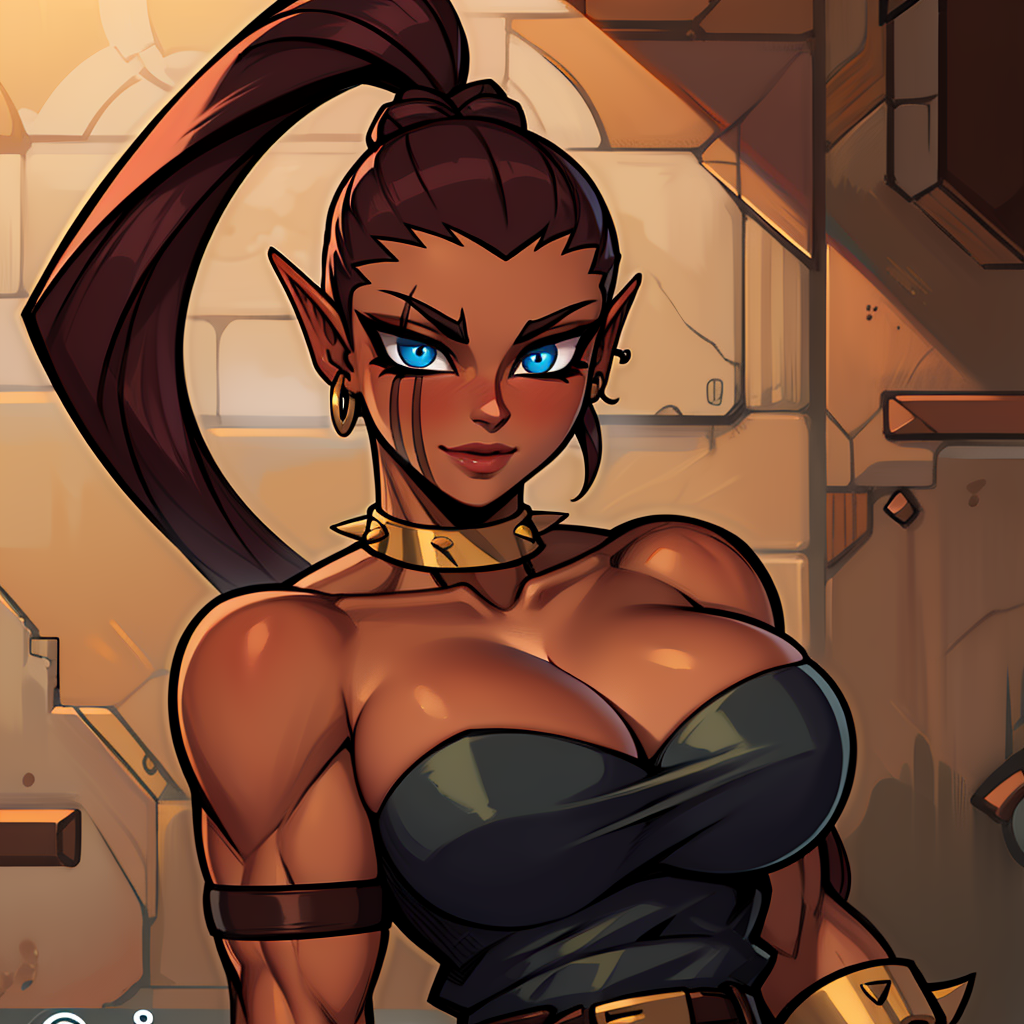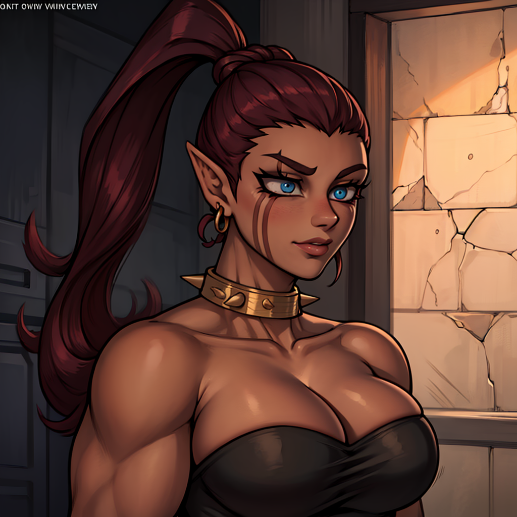 외모 태그: 파란 눈, 뾰족한 귀, 갈색 머리, 긴 머리, 토끼꼬리, 짙은 피부, 검은 탱크탑, 가슴 노출, 어깨 드러남, 스트랩 없음, 보석, 귀걸이, 팔찌, 치커, 근육질 여성, 벨트, 손가락 없음 장갑, 장갑, 얼굴에 흉터