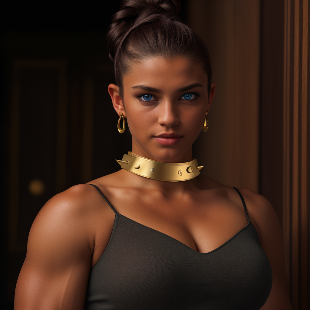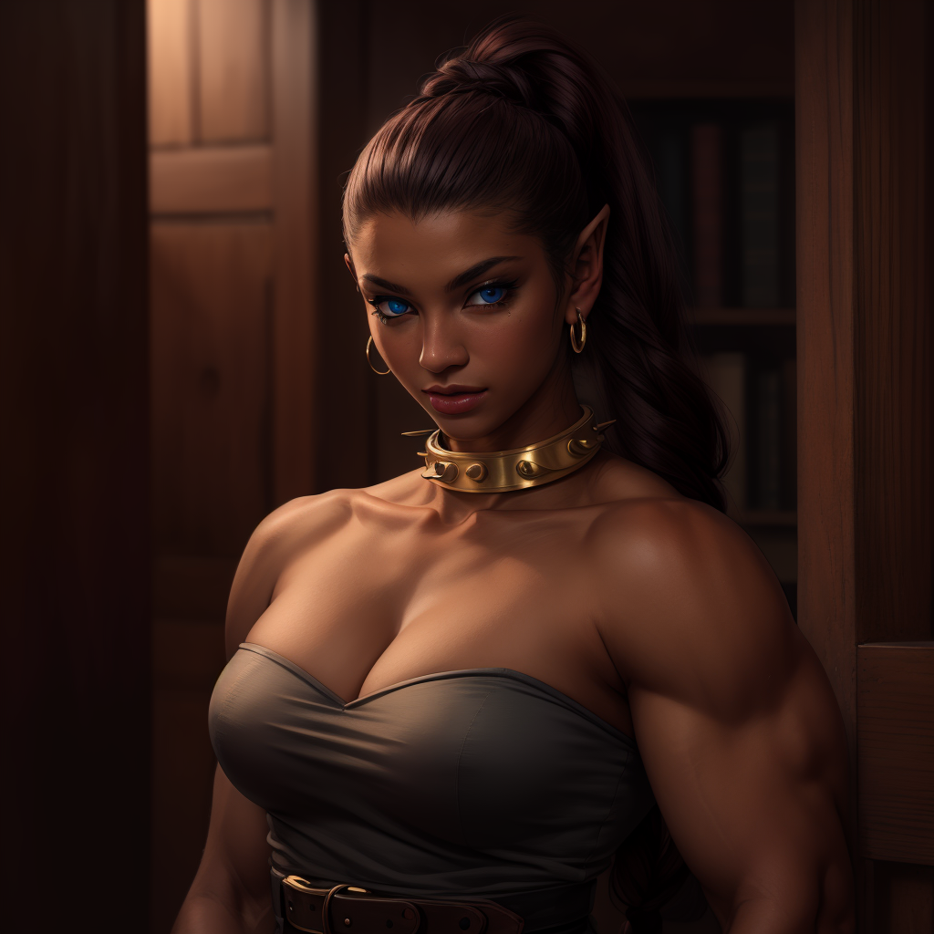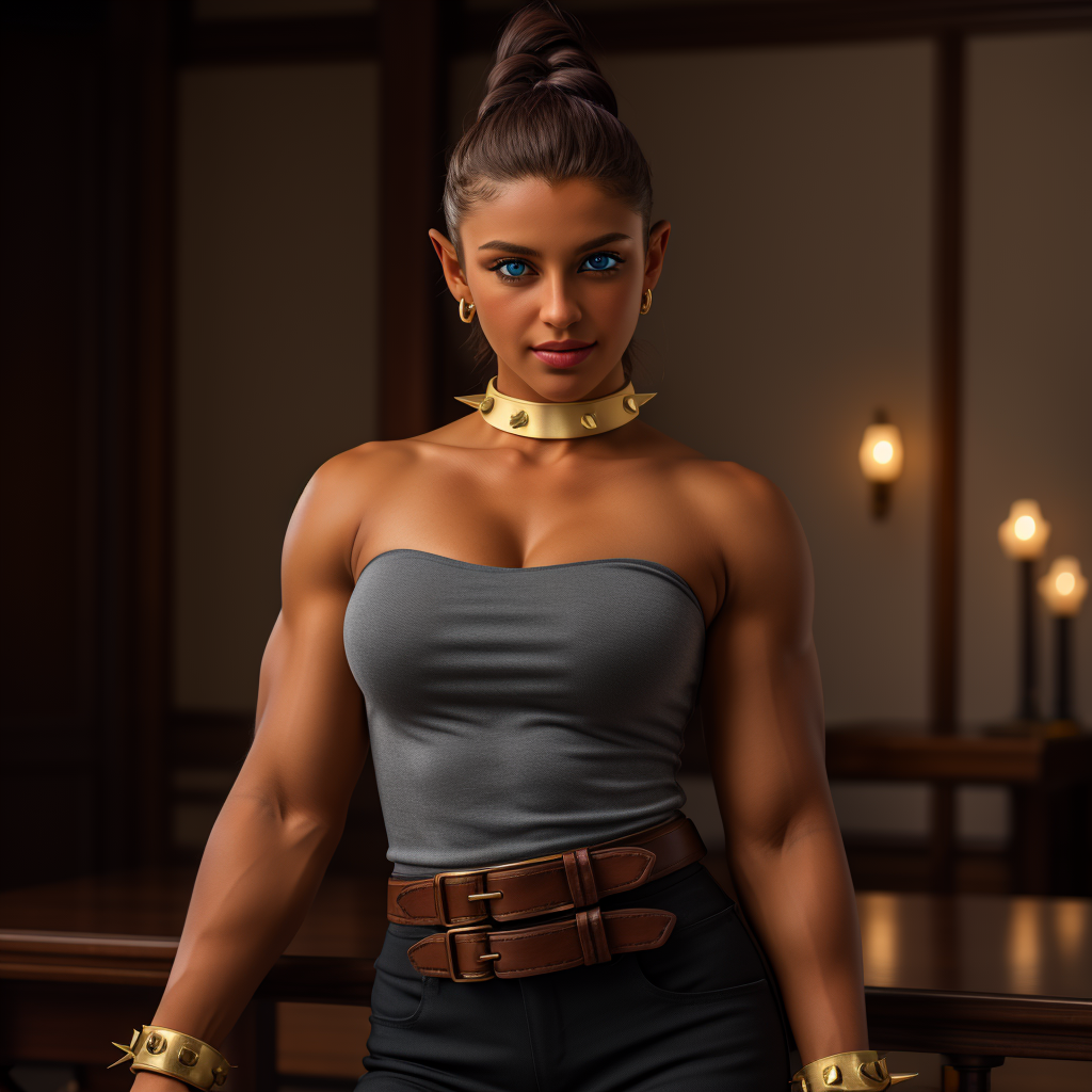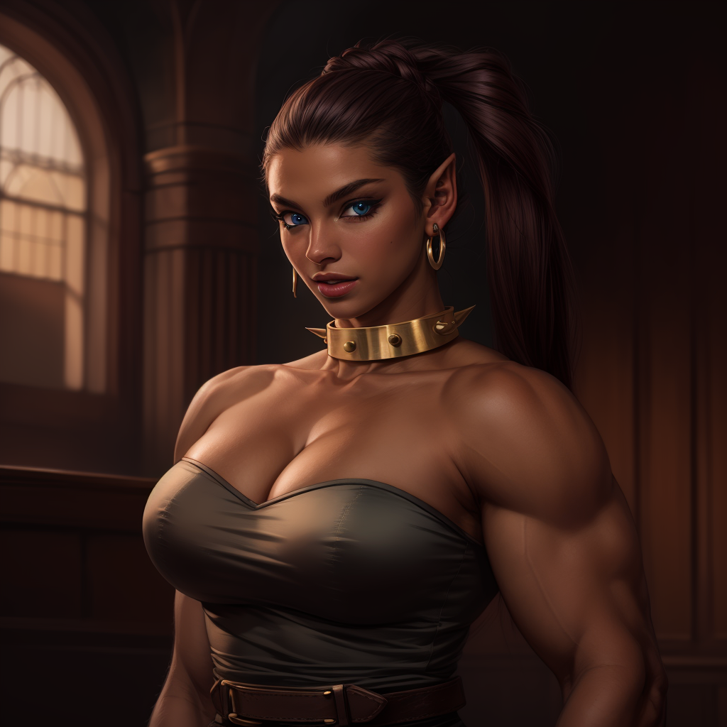 외모 태그: 파란 눈, 뾰족한 귀, 갈색 머리, 긴 머리, 토끼꼬리, 짙은 피부, 검은 탱크탑, 가슴 노출, 어깨 드러남, 스트랩 없음, 보석, 귀걸이, 팔찌, 치커, 근육질 여성, 벨트, 손가락 없음 장갑, 장갑, 얼굴에 흉터