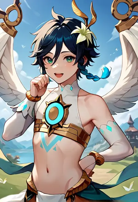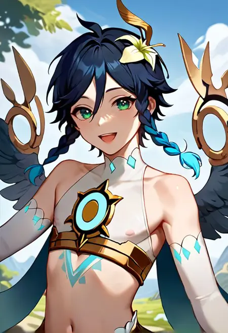 デフォルトの服装: デフォルトの服装、翼、裸の腰、裸の臀部、髪の花