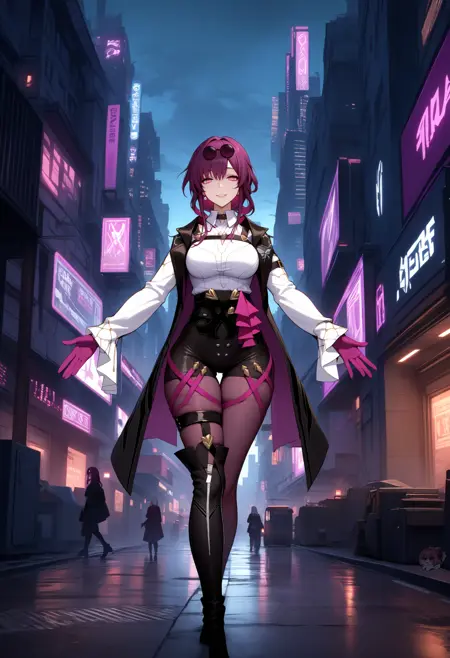 服装:kafka,眼镜戴在头上,微笑,有领衬衫,胸甲,外套搭在肩上,紫色手套,高腰短裤,短裤下穿丝袜,大腿绑带,长袖,不对称鞋履,单腿长靴,腿部腰带,黑色靴子