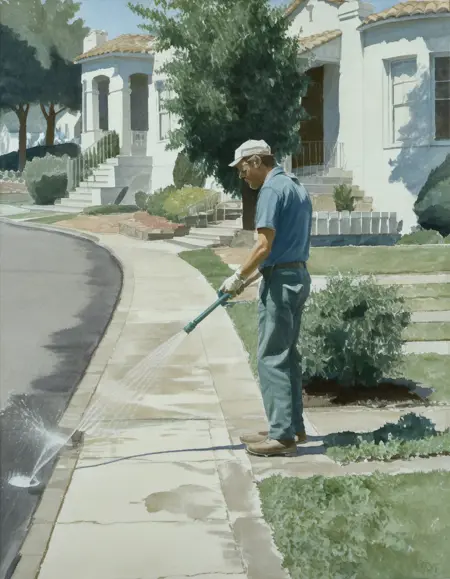 a painting of a man watering the sidewalk in the style of robert-betchtle