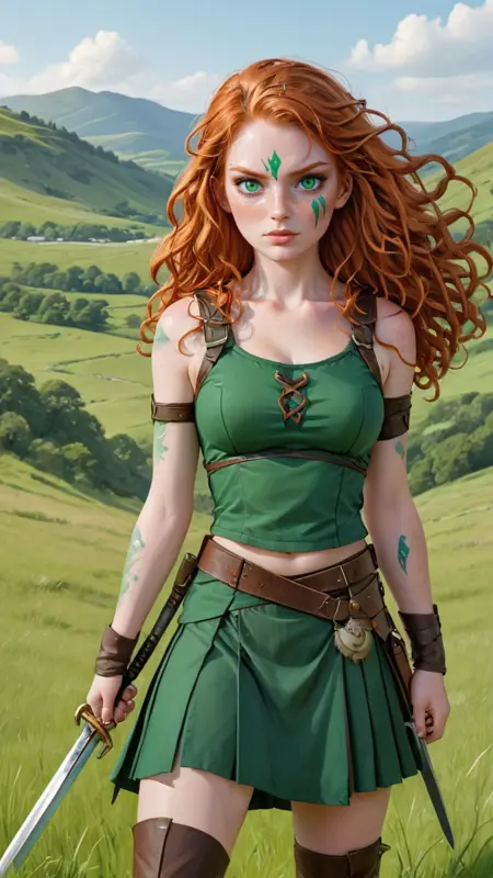 外观标签:1girl,长发,嘴唇,雀斑,红发,红发,苍白皮肤,橄榄绿眼睛,波浪发,卷发,娇小,丰满,