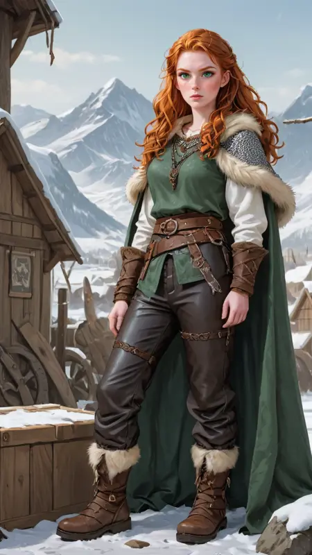 外观标签(可选):一位拥有长而波浪状红发、橄榄绿眼睛和雀斑的女性,体型娇小且丰满,