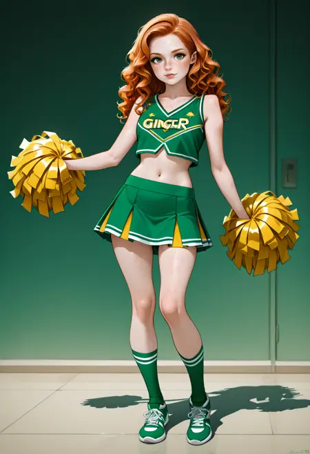 Appearance Tags: 1girl, long hair, lips, freckles, redhead, ginger, pale skin, olive green eyes, wavy hair, curly hair, petite, busty,