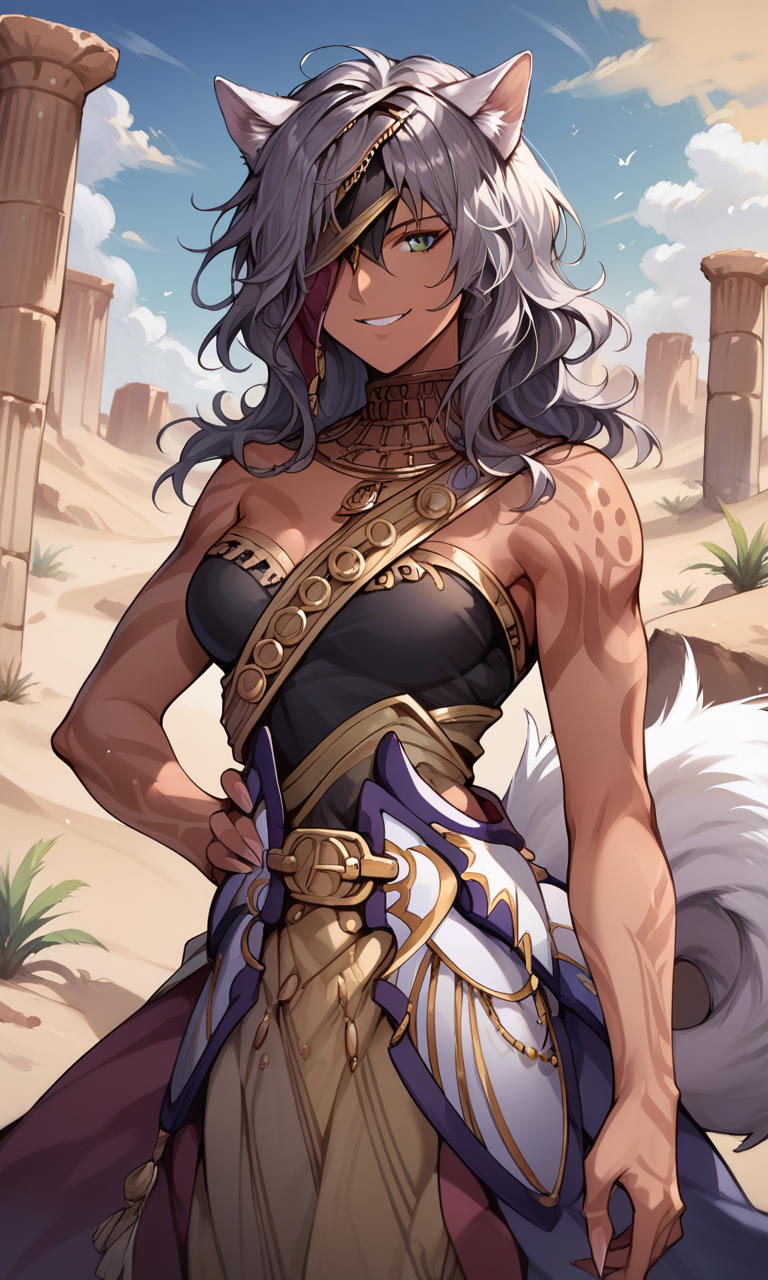 Nailah, wolf ears, wolf tail, dark skinned female, one eye covered
