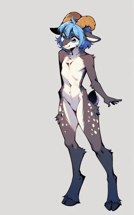 Reinforcement Tags: hooves, digitigrade, furry, horns, blue eyes, flat chest, animal ears, blue hair, white fur, medium hair, sheep ears, body fur, grey fur, multicolored skin, multicolored fur**