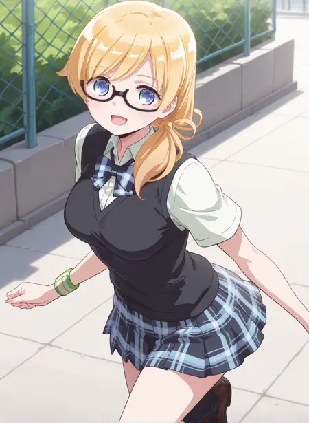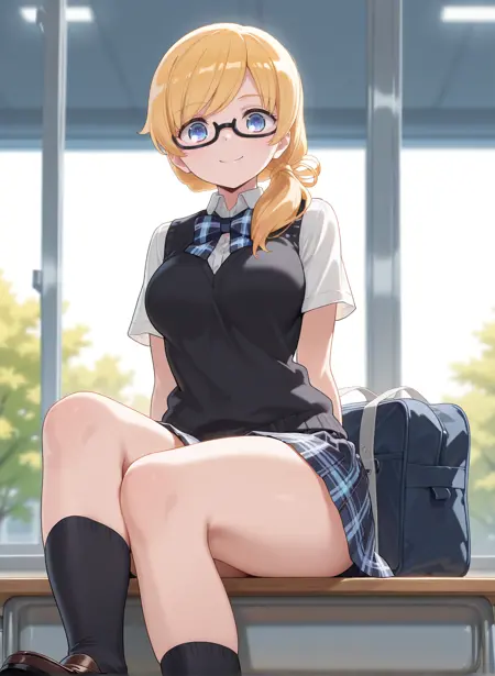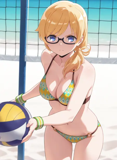 thomas emily, harukana receive, blonde hair, long hair, blue eyes, under-rim eyewear, hair over shoulder, side ponytail, medium breasts