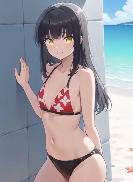 toi_narumi, black hair, long hair, yellow eyes, small breasts, blunt bangs
