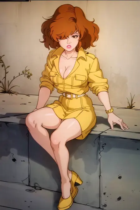 선택적 트리거워드: 1980s (스타일), 갈색 머리, 회색 눈, 입술, 립스틱, 짧은 머리, 노란 셔츠