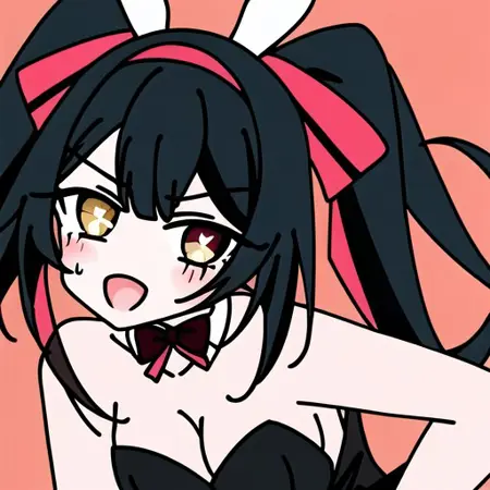 ②1girl, solo, animal ears, rabbit ears, bow, pink background, open mouth, bowtie, looking at viewer, playboy bunny, simple background, bangs, necktie, detached collar, x hair ornament, fake animal ears, heart, sweatdrop, smile, upper body, hairband (512X512)
