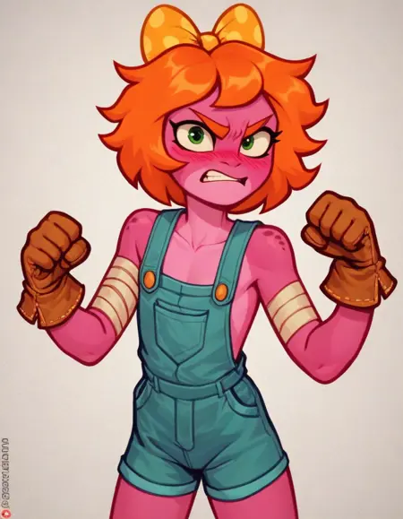 Pony V2, IL V1: 분홍 피부, 머리 리본, 주황색 머리, 파란 오버올, 붕대 감긴 팔, 붕대 감긴 다리, 한 손 장갑, 파란 혀