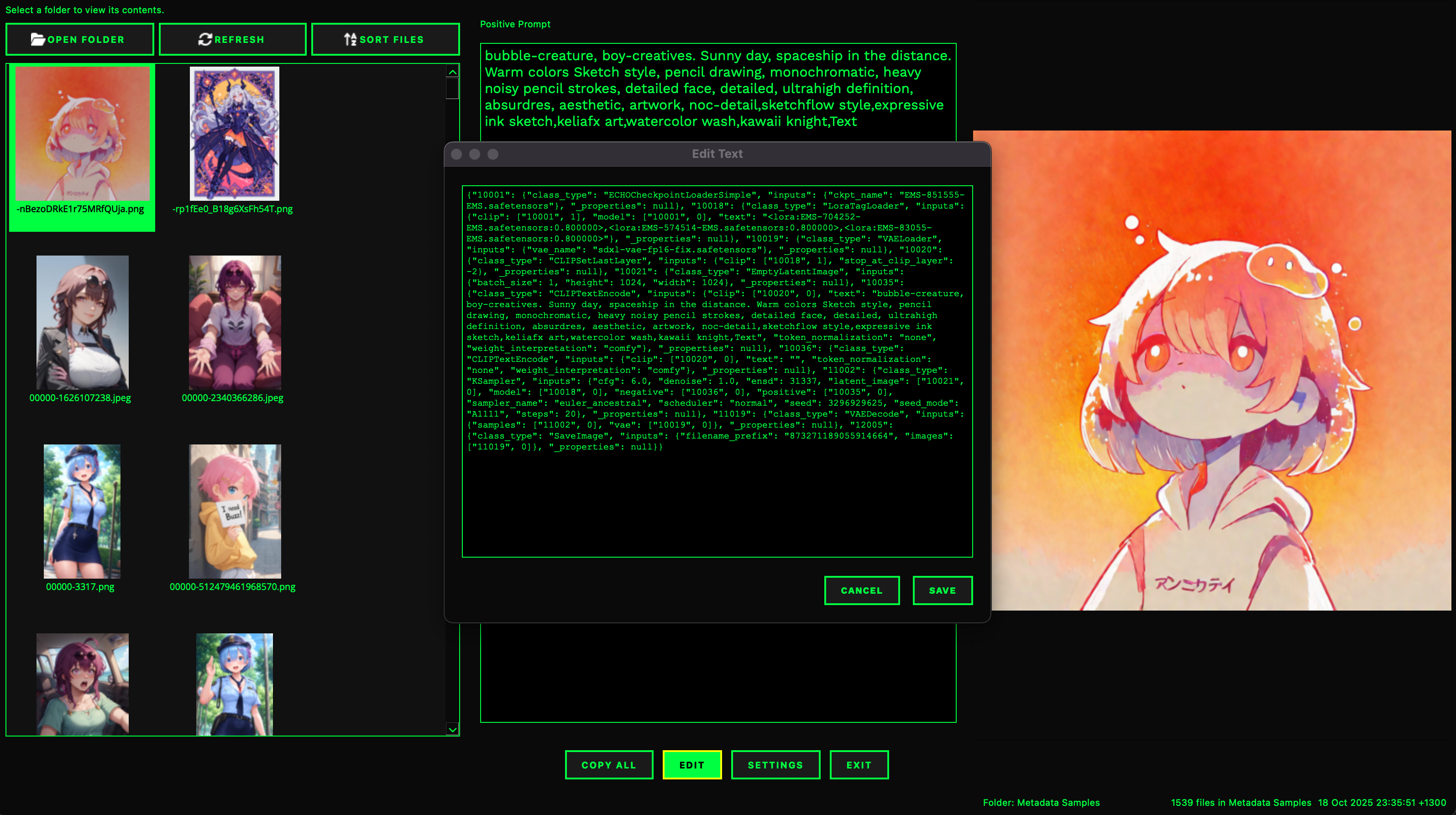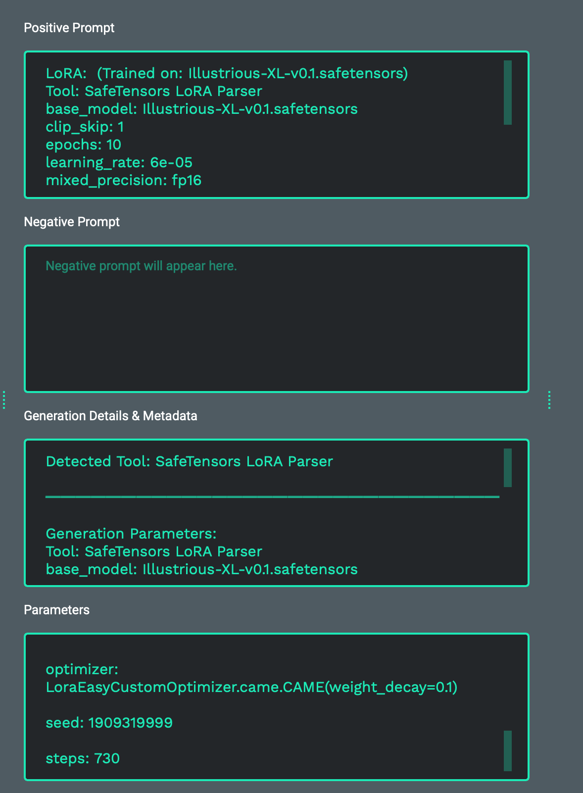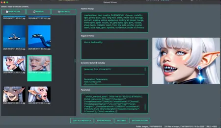 • 元数据显示:解析的提示(正向、负向)、生成参数(步数、采样器、CFG、种子等)及其他相关信息将显示在图像预览下方/旁边的文字区域中。提示信息和生成信息的标题将根据检测内容自动更新。