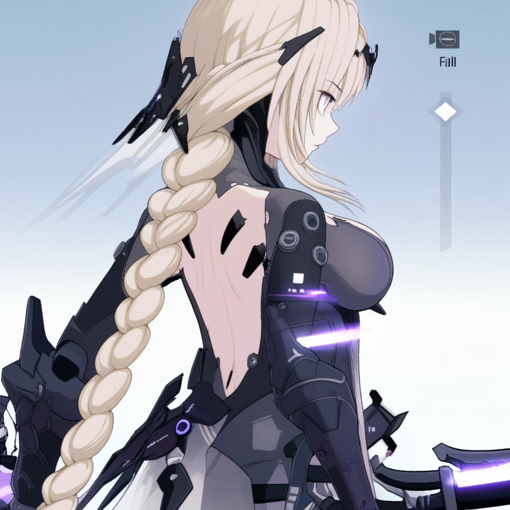 blonde hair, large breasts, 1girl, purple eyes, long hair, braid, bodysuit, dress, cleavage, cleavage cutout, mechanical arms, headgear,