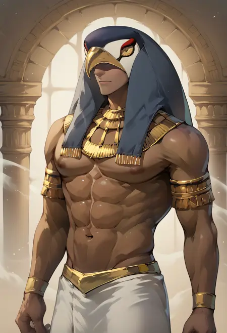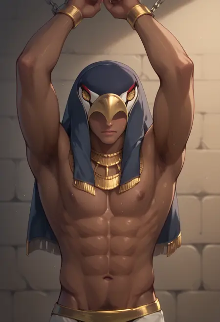 衣装プロンプト:ハヤブサのマスク、ゴールドのウセク、上半身裸、白いシェンドイト、ゴールドのベルト、ビーズ付きゴールドの腕輪、ゴールドのブレスレット、ゴールドの足首輪
