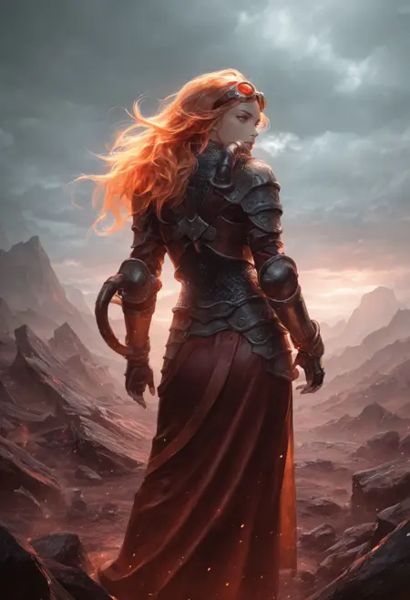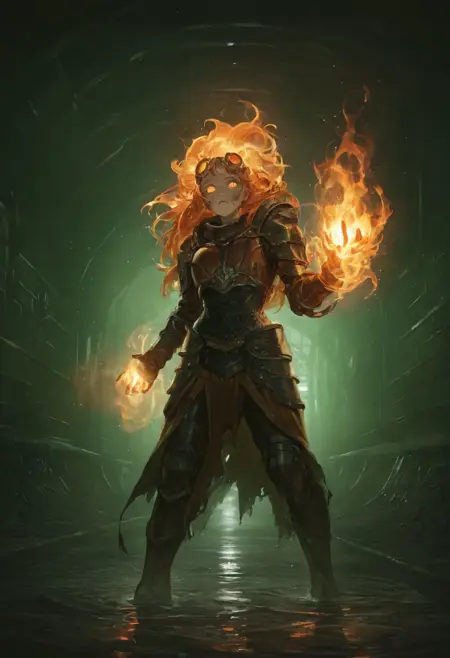 ピロマンサー: chandra, 1girl, fiery hair, glowing eyes, armor, googles on head