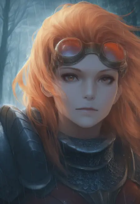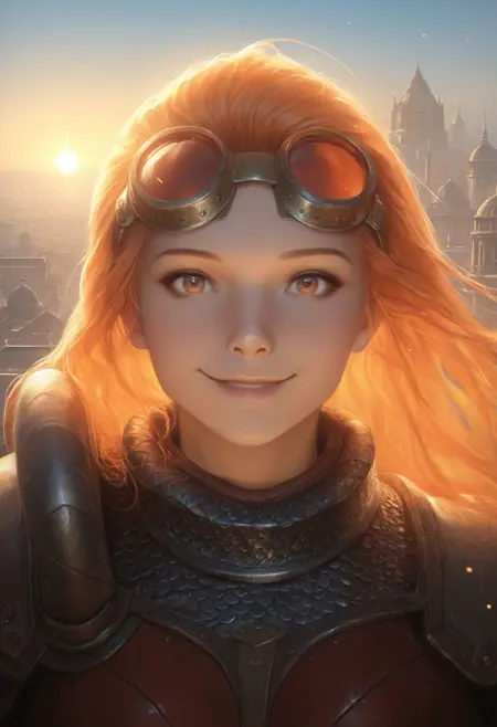 レギュラー: chandra, 1girl, orange hair, brown eyes, armor, googles on head