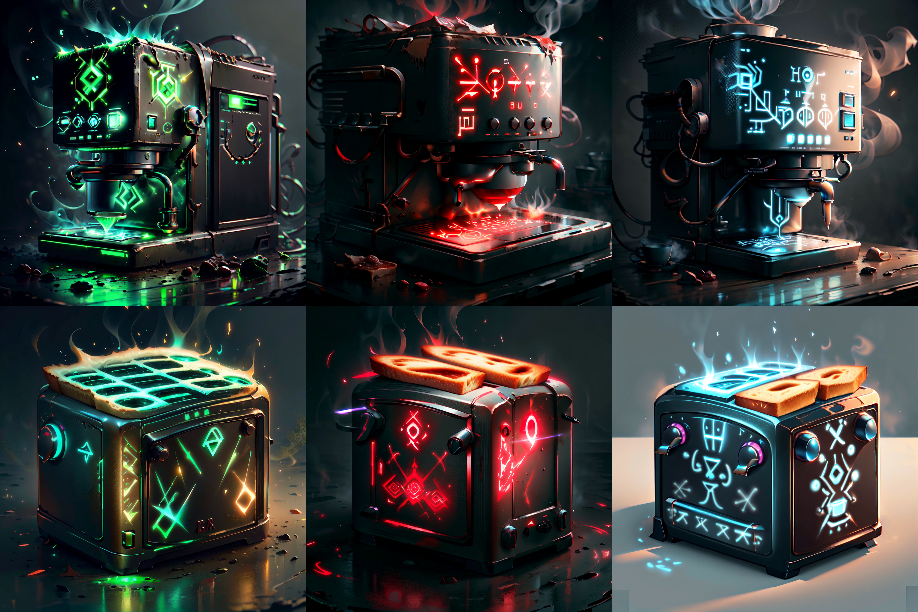 発光する魔法の印文字を生成しました——赤、薄い青、緑、紫、黄色、ピンク。