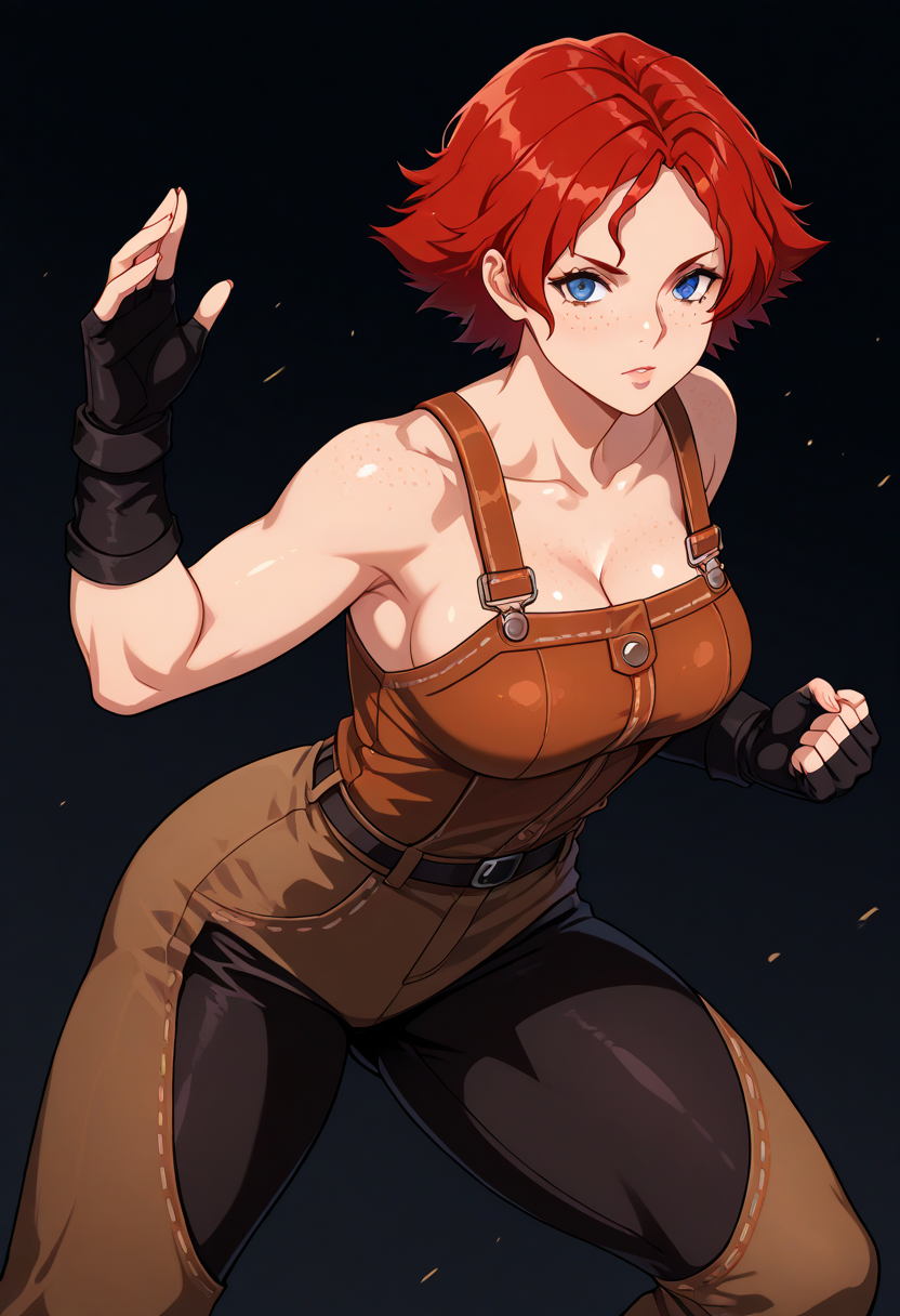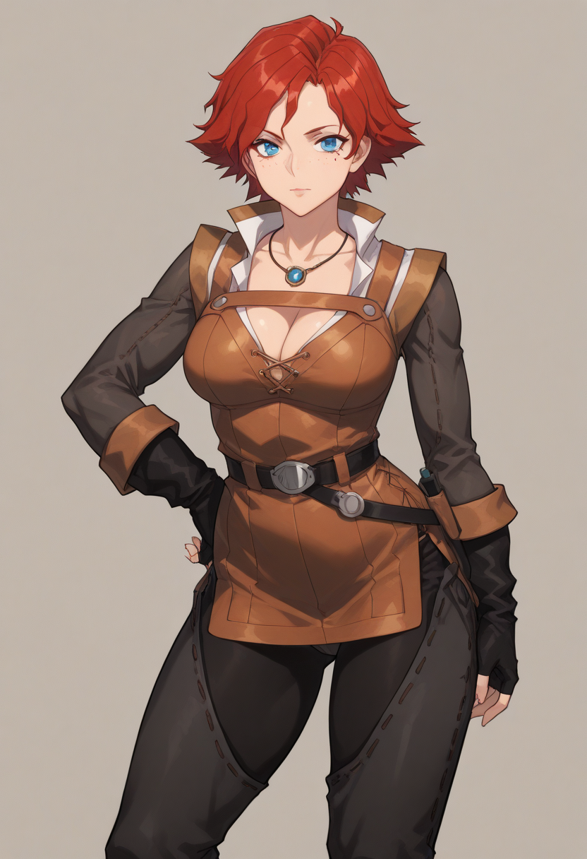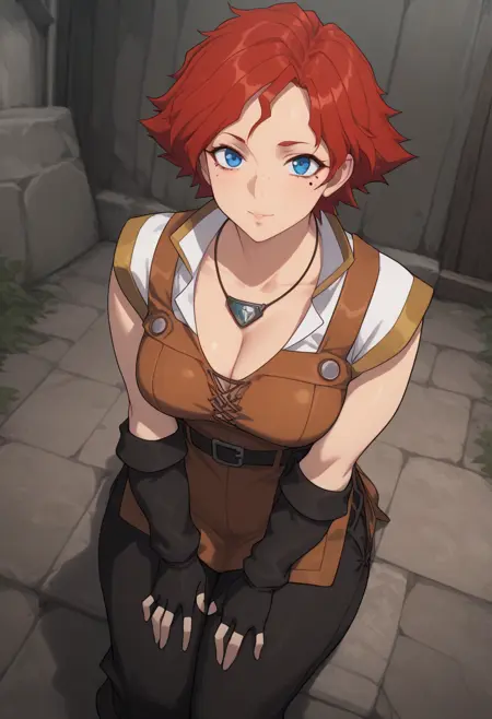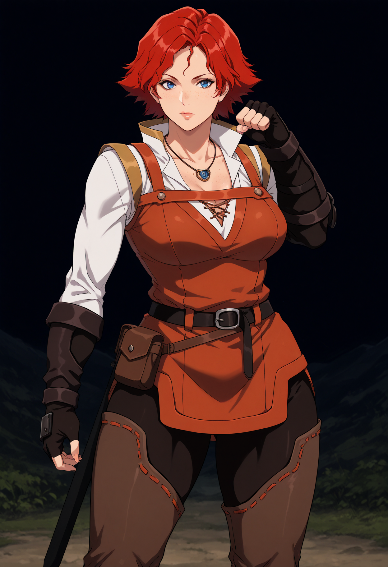 오버로드의 브리타. 무게 0.6-1. 세계 키워드 "브리타"触发. 1소녀, 혼자, 톰보이, 단단한 체형, 파란 눈, 빨간 머리, 단발, 두더지점, 목걸이, 바지, 허벅지까지 오는 깔창, 손가락 없는 장갑, 부츠. 프롬프트로 시작하세요.