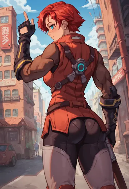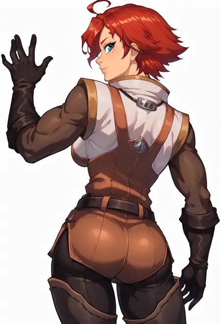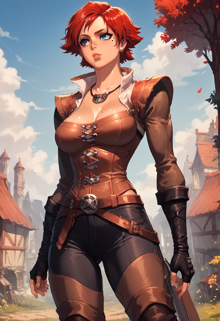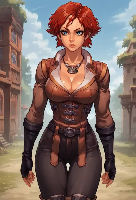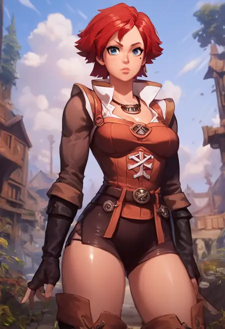 Brita from Overlord. Weight 0.6-1. Trigger world "Brita". 1girl, solo, tomboy, toned body, blue eyes, red hair, short hair, freckles, necklace, pants, thigh high gaiters, fingerless gloves, boots. Prompt to start with.