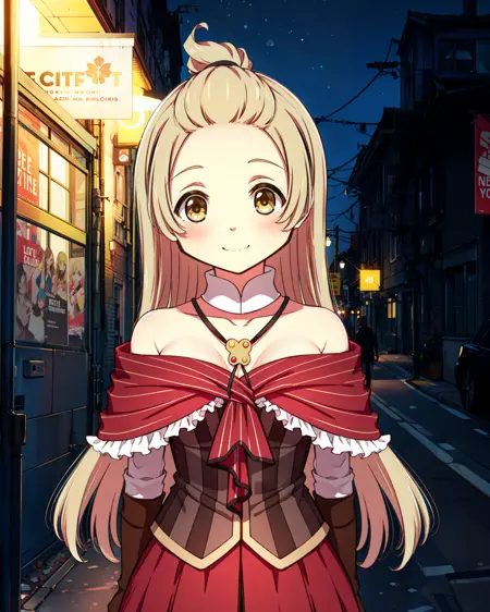 魔法衣装: mgrcazumihagumu, hgmmgc, 茶色のヘアクリップ, 白い取り外し可能カラー, 黒いネックレス, 金色のペンダント, 赤いフリル付きオフショルダードレス, 白いフリル, 茶色のコルセット, 茶色のエルボーグローブ, 赤いフリルスカート, ピンクのパンティーホース