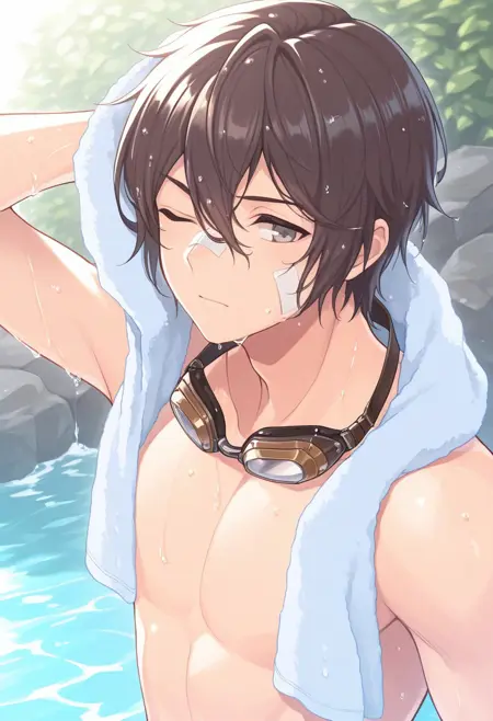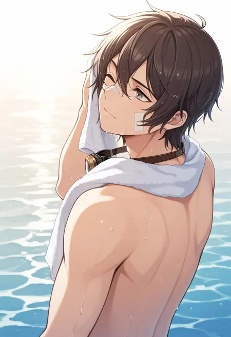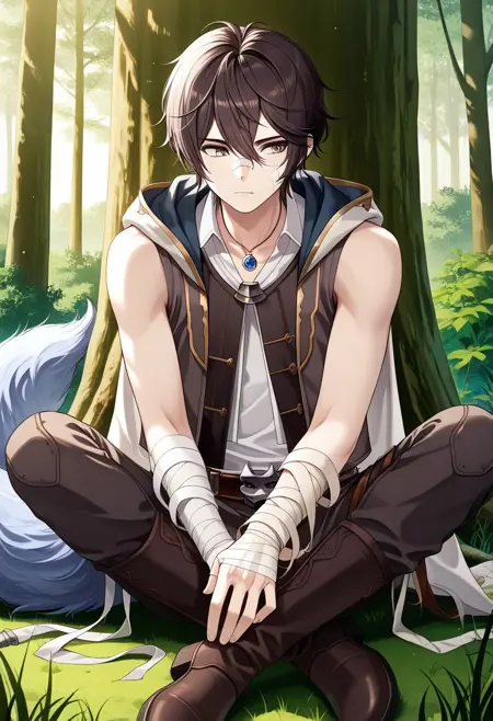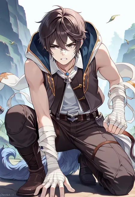 ayer, 1boy, male focus, solo, brown eyes, brown hair, short hair, hair between eyes, jewerly, necklace, bandages, bandaid on nose, bandaid on cheek, shirt, collared shirt, white shirt, sleeveless, jacket, brown jacket, sleeveless jacket, open jacket, open clothes, hood, scarf, white scarf, bandaged arm, white bandages, belt, pants, brown pants, tail, blue tail, fluffy tail, boots, brown footwear,