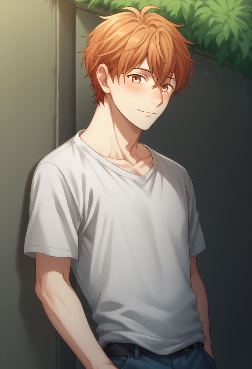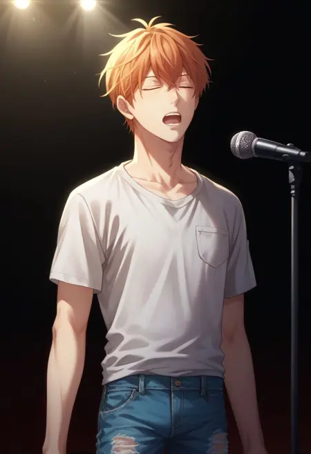 Stage: 마후유, 남성 중심, 1소년, 연어색 머리, 바지, 셔츠, 갈색 눈, 찢어진 옷, 청바지, 찢어진 바지, 빨간 신발