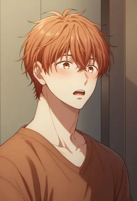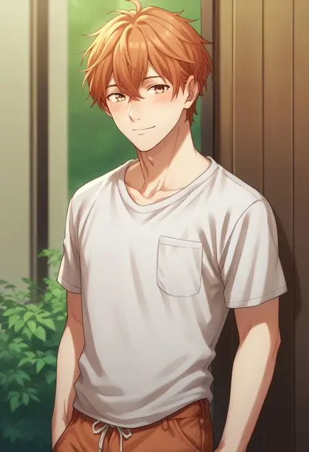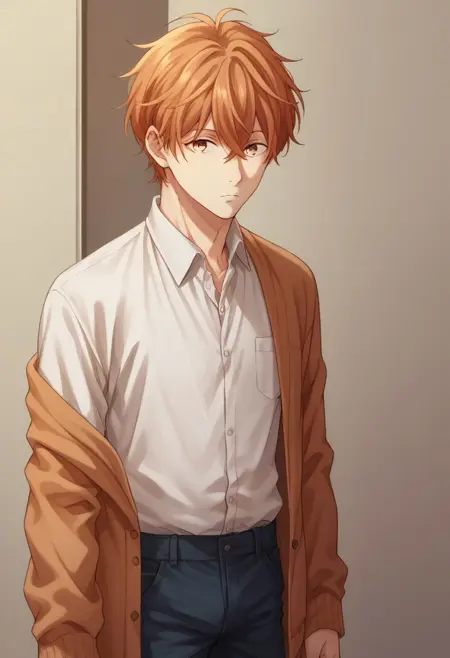 School: 마후유, 남성 중심, 1소년, 연어색 머리, 바지, 셔츠, 갈색 눈, 셔츠, 흰 셔츠, 칼라 셔츠, 카디건, 바지, 신발