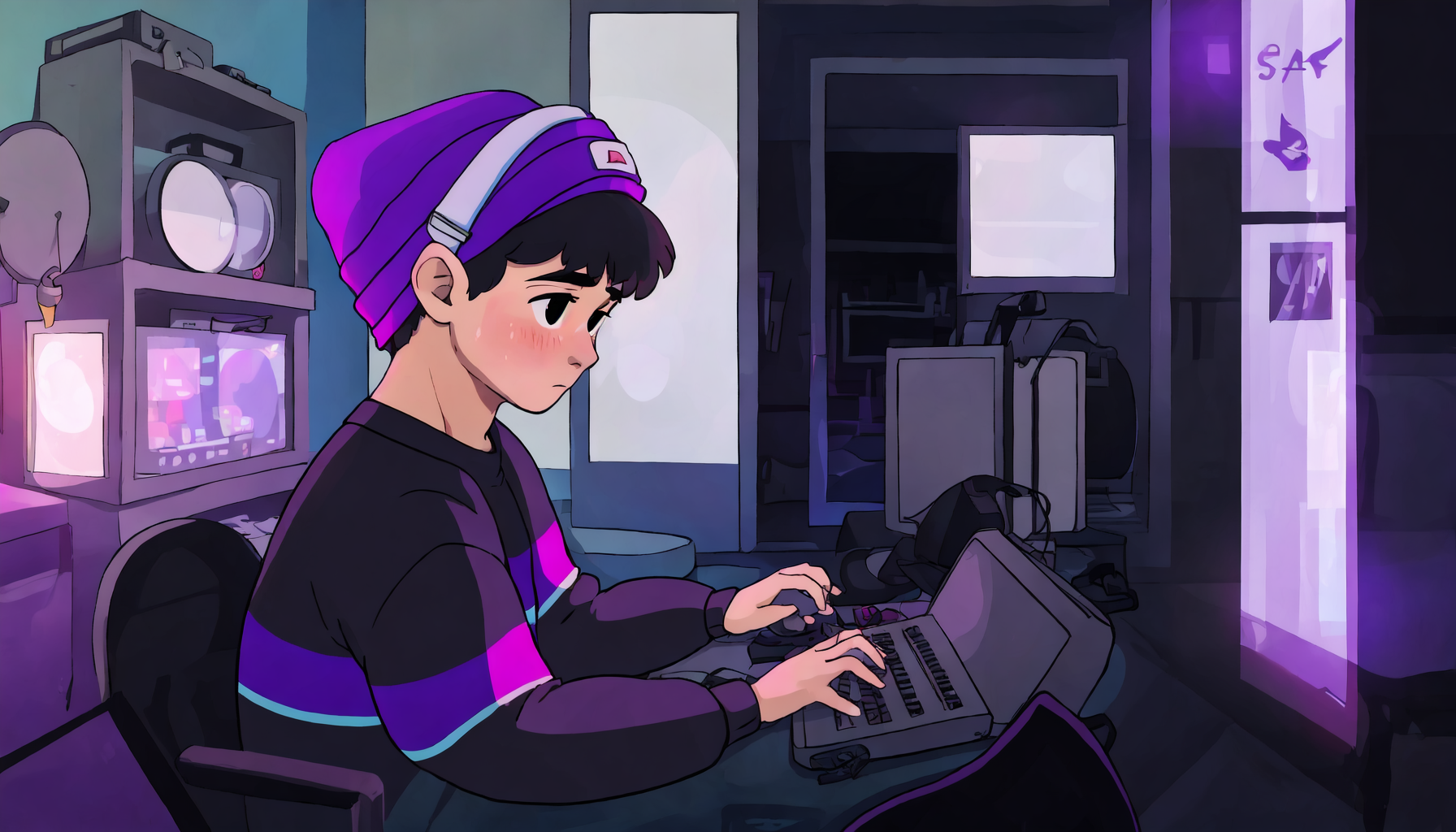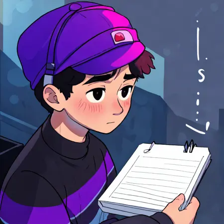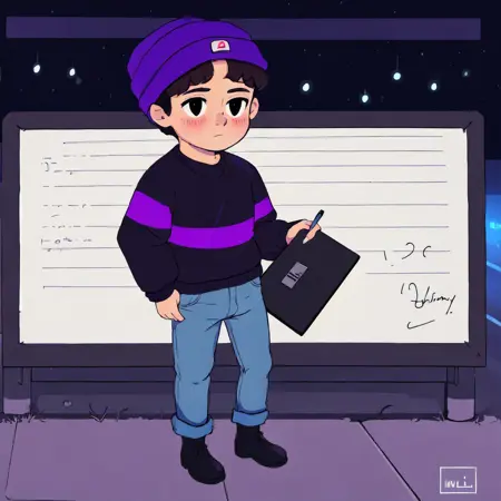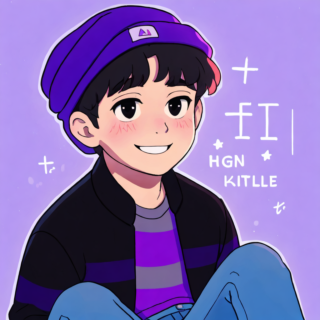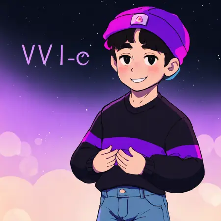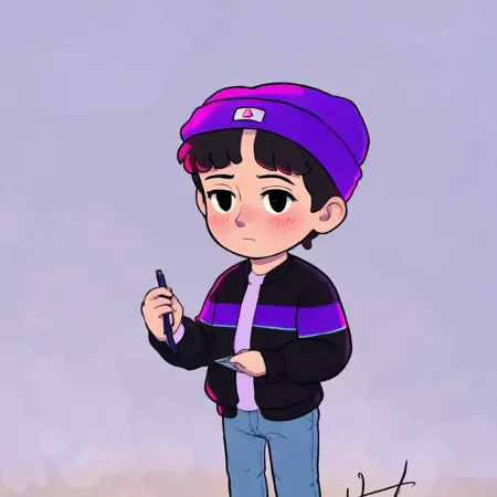 Lo-Fi, LoFi, lofi, 1boy, boy, black and purple striped sweater, light blue jeans, purple hat, black eyes, solo