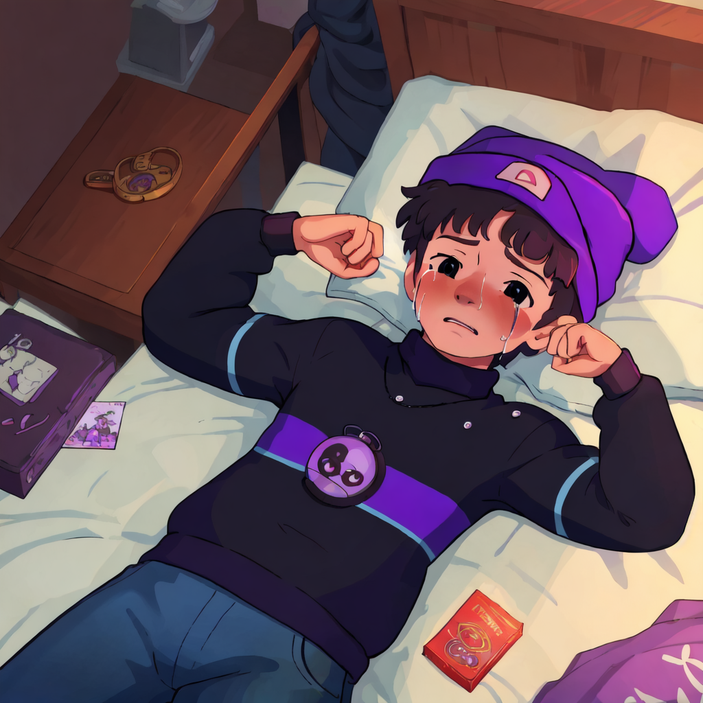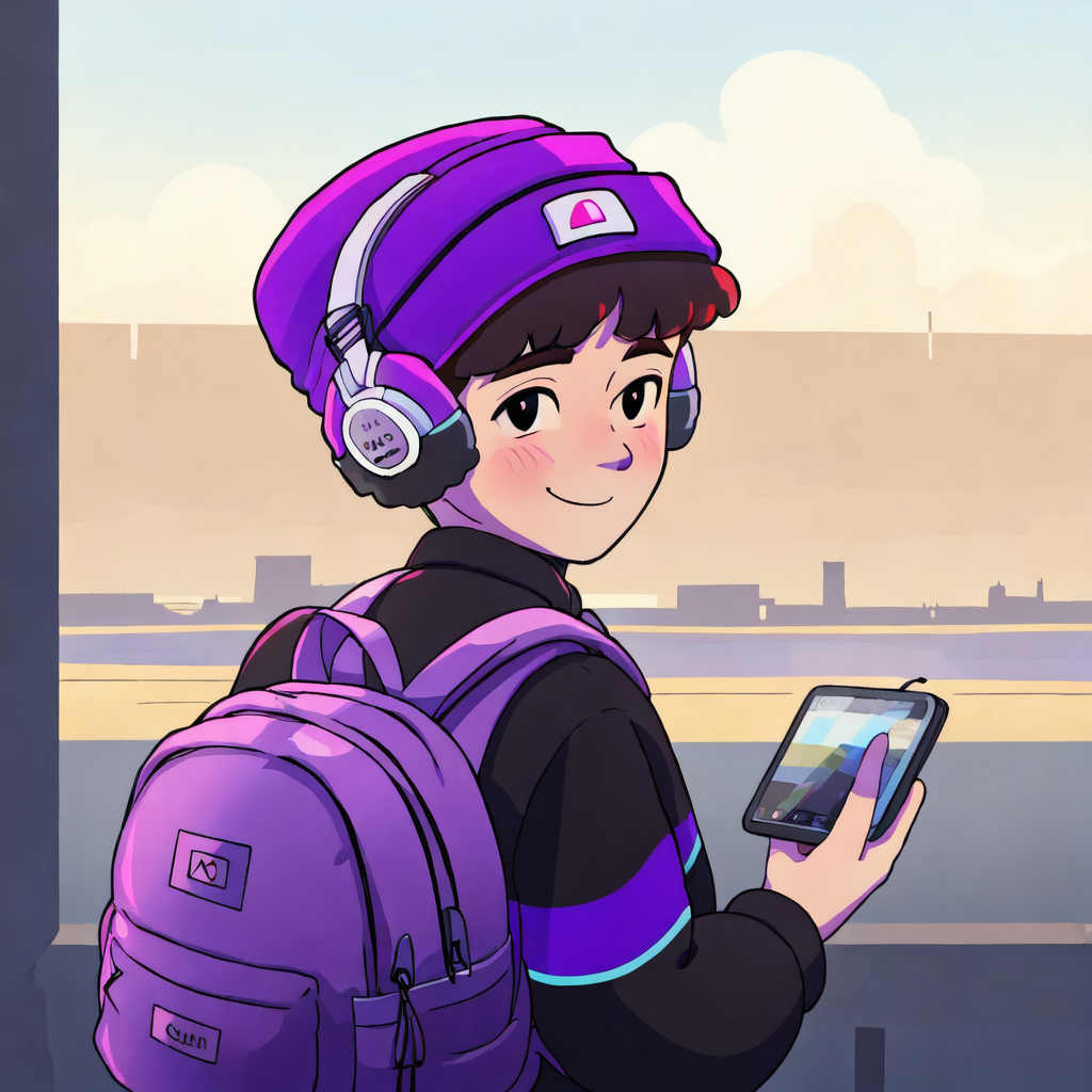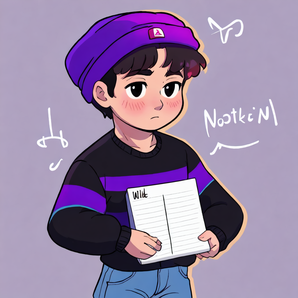 Lo-Fi, LoFi, lofi, 1boy, boy, black and purple striped sweater, light blue jeans, purple hat, black eyes, solo