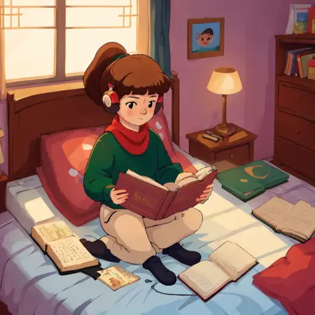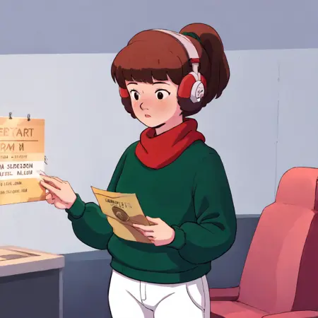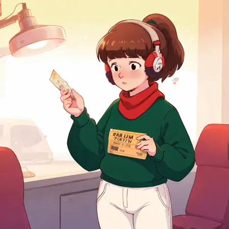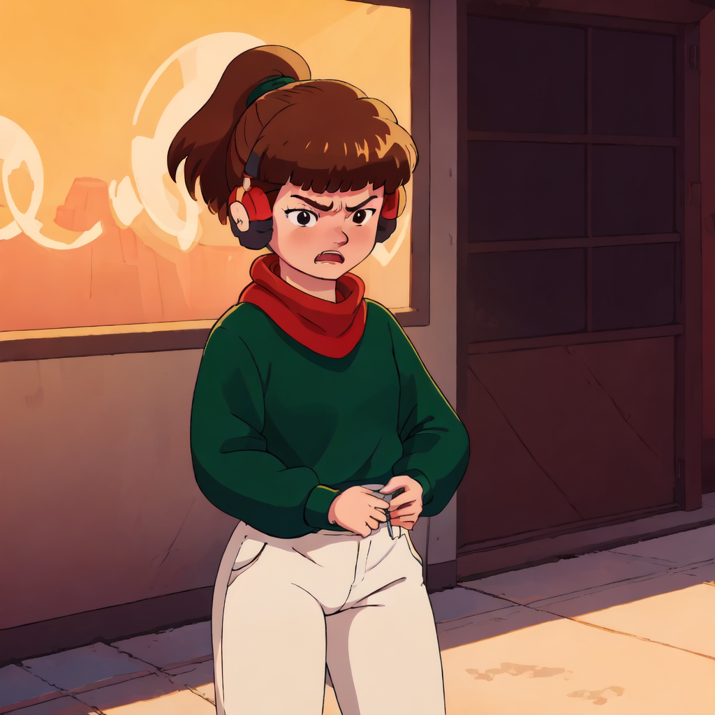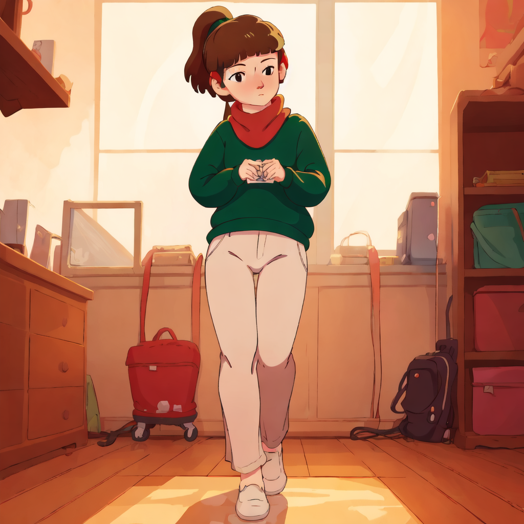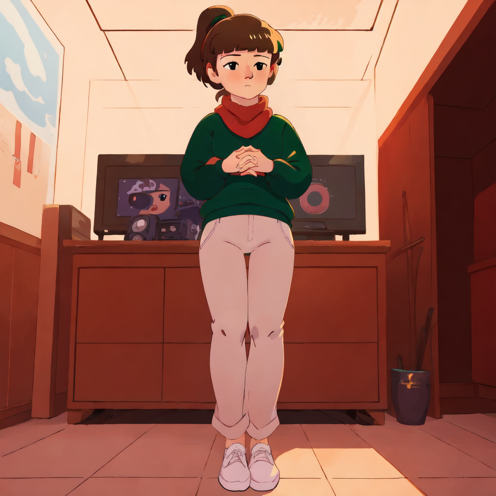 Lo-Fi, LoFi, Green sweater, Red scarf, 1girl, solo, ponytail, brown hair, blush, black eyes, white pant