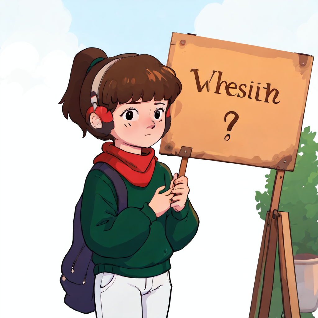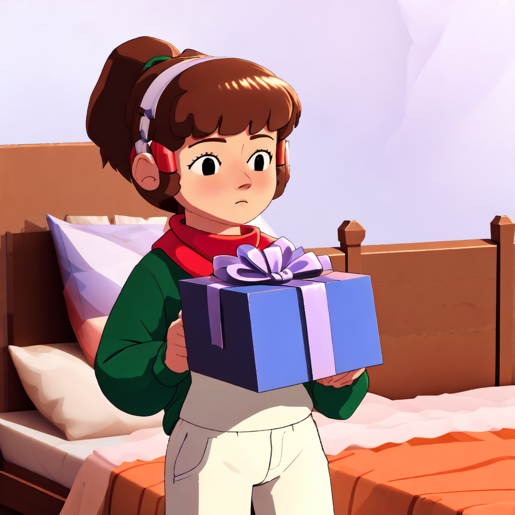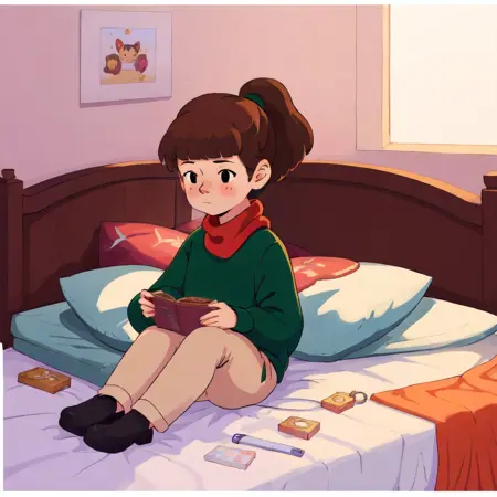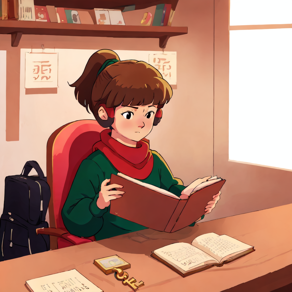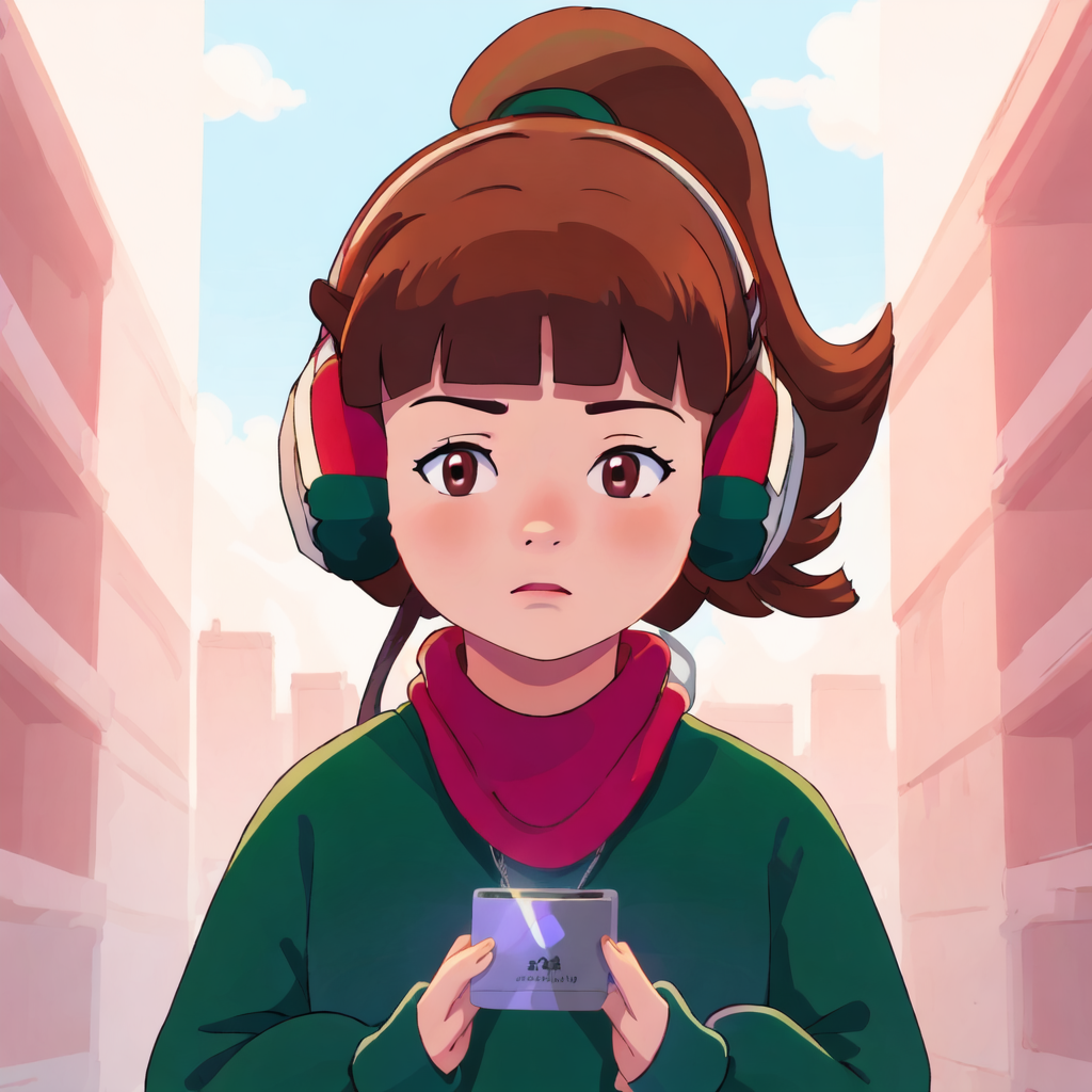 Lo-Fi, LoFi, Green sweater, Red scarf, 1girl, solo, ponytail, brown hair, blush, black eyes, white pant