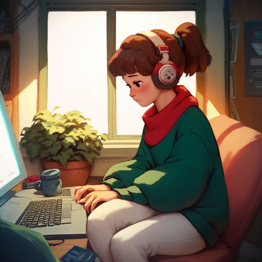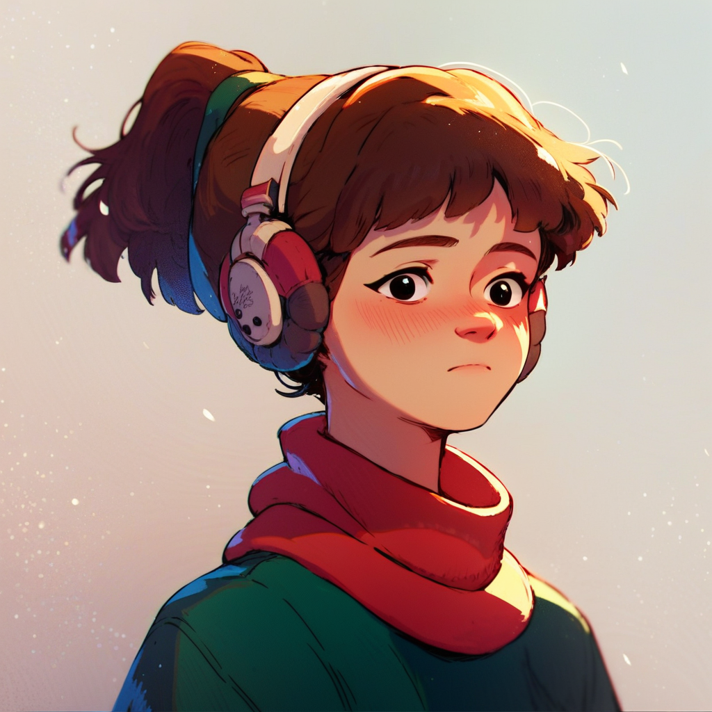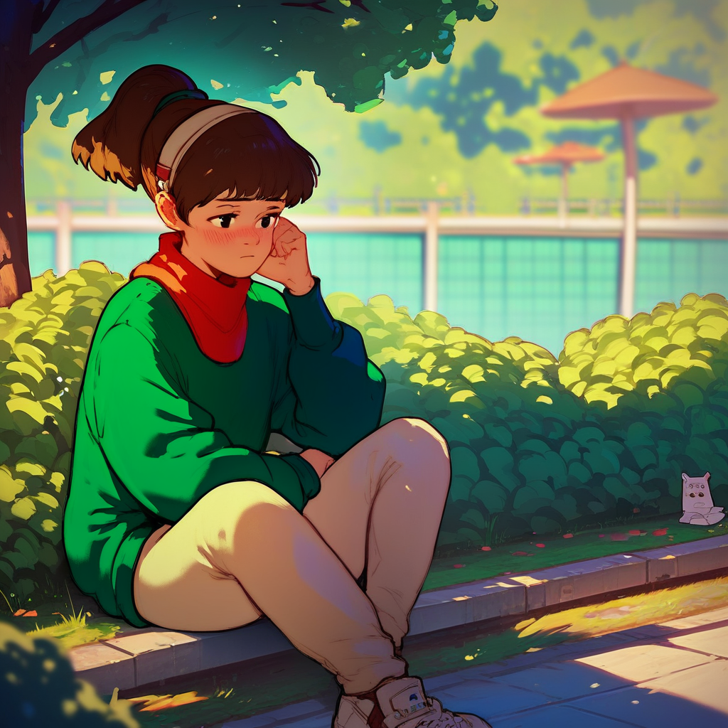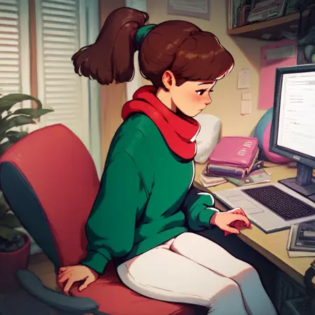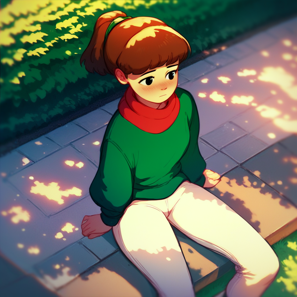 Lo-Fi, LoFi, Green sweater, Red scarf, 1girl, solo, ponytail, brown hair, blush, black eyes, white pant