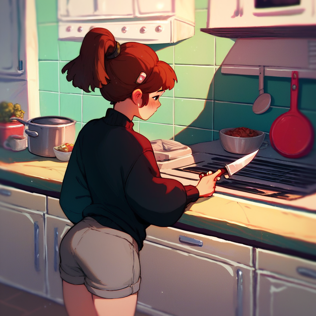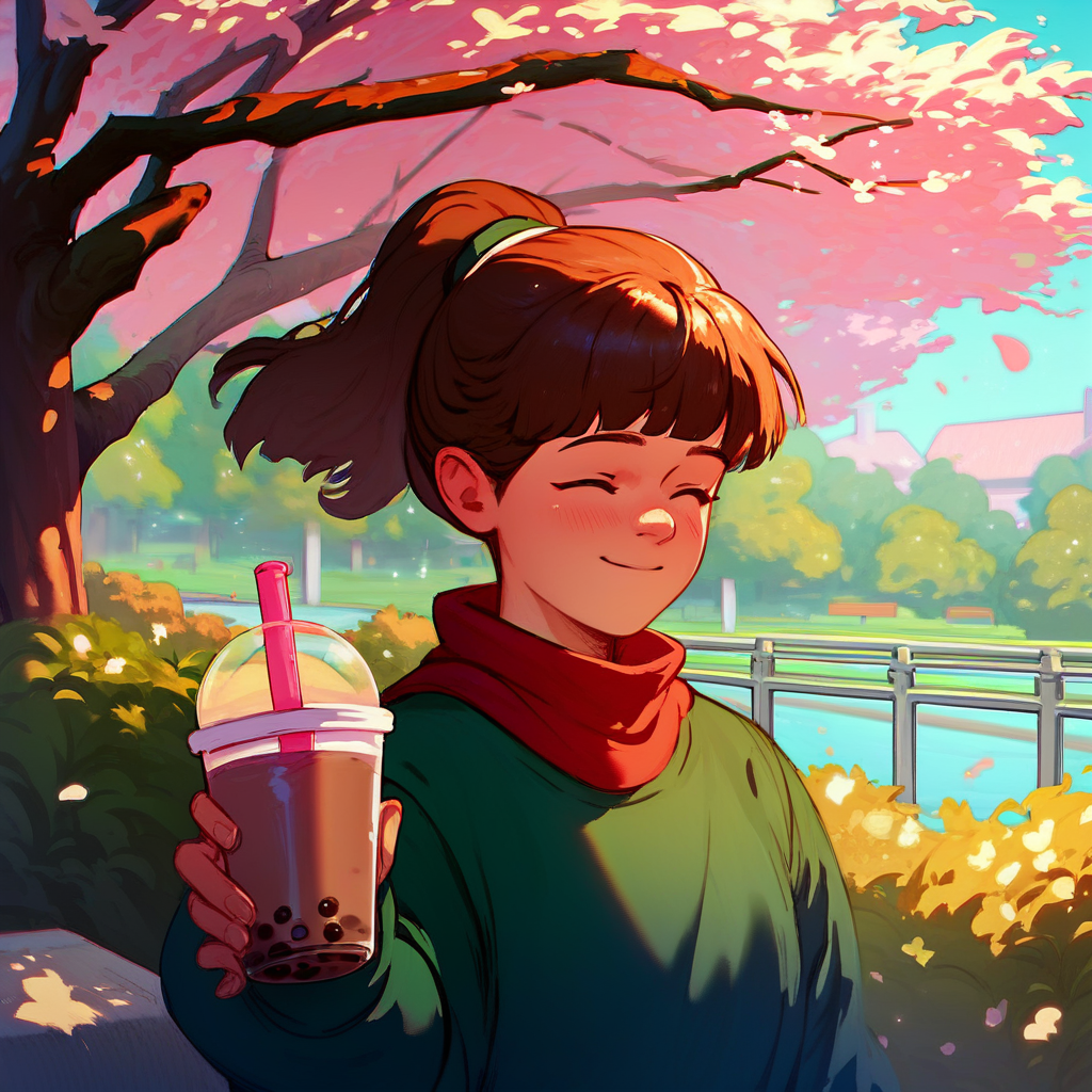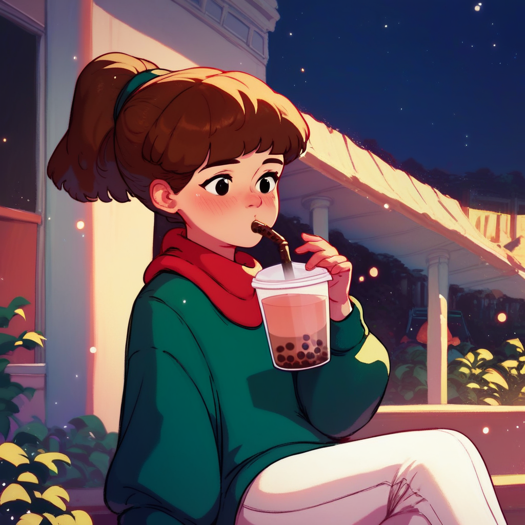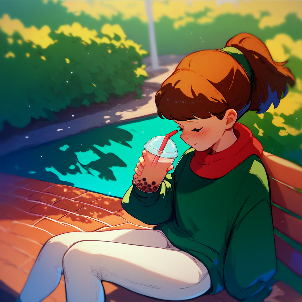 Lo-Fi, LoFi, Green sweater, Red scarf, 1girl, solo, ponytail, brown hair, blush, black eyes, white pant