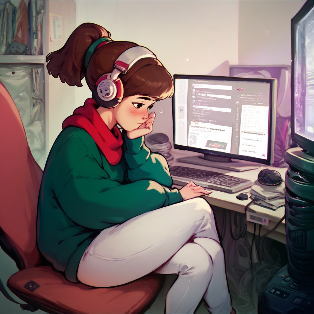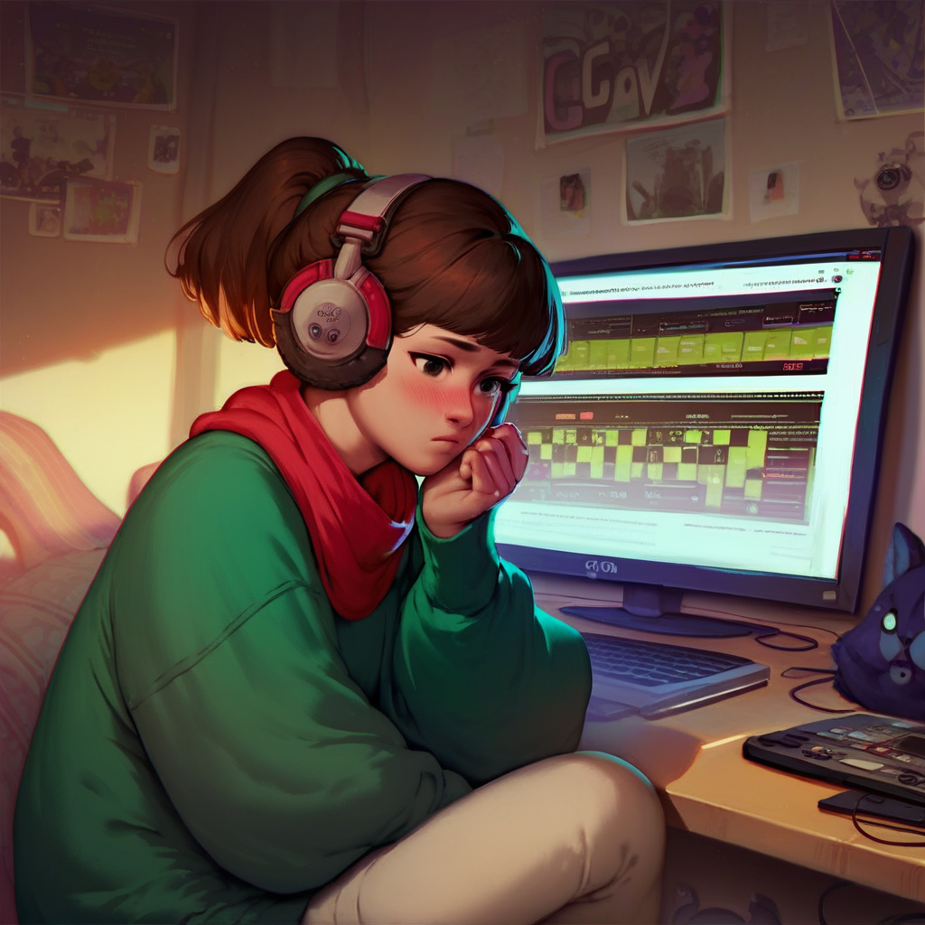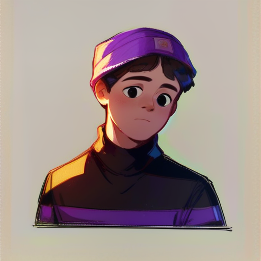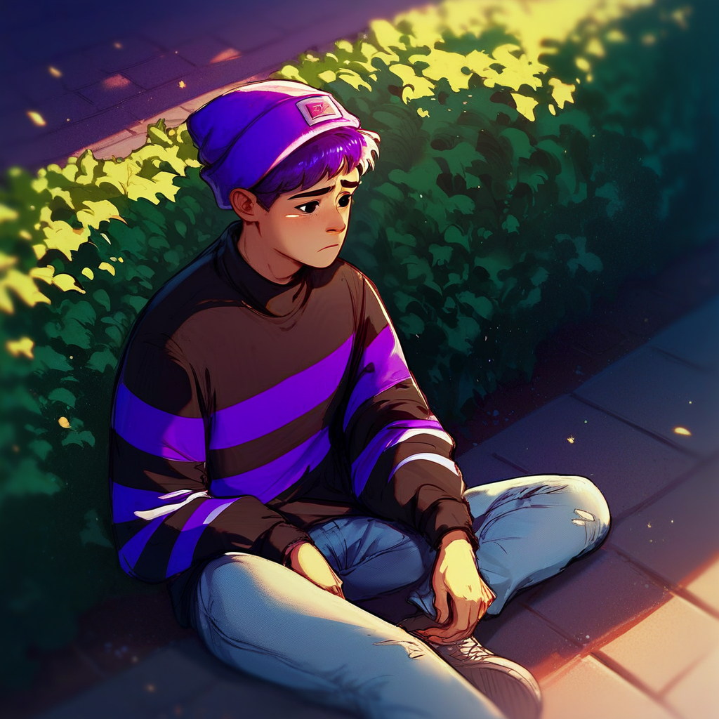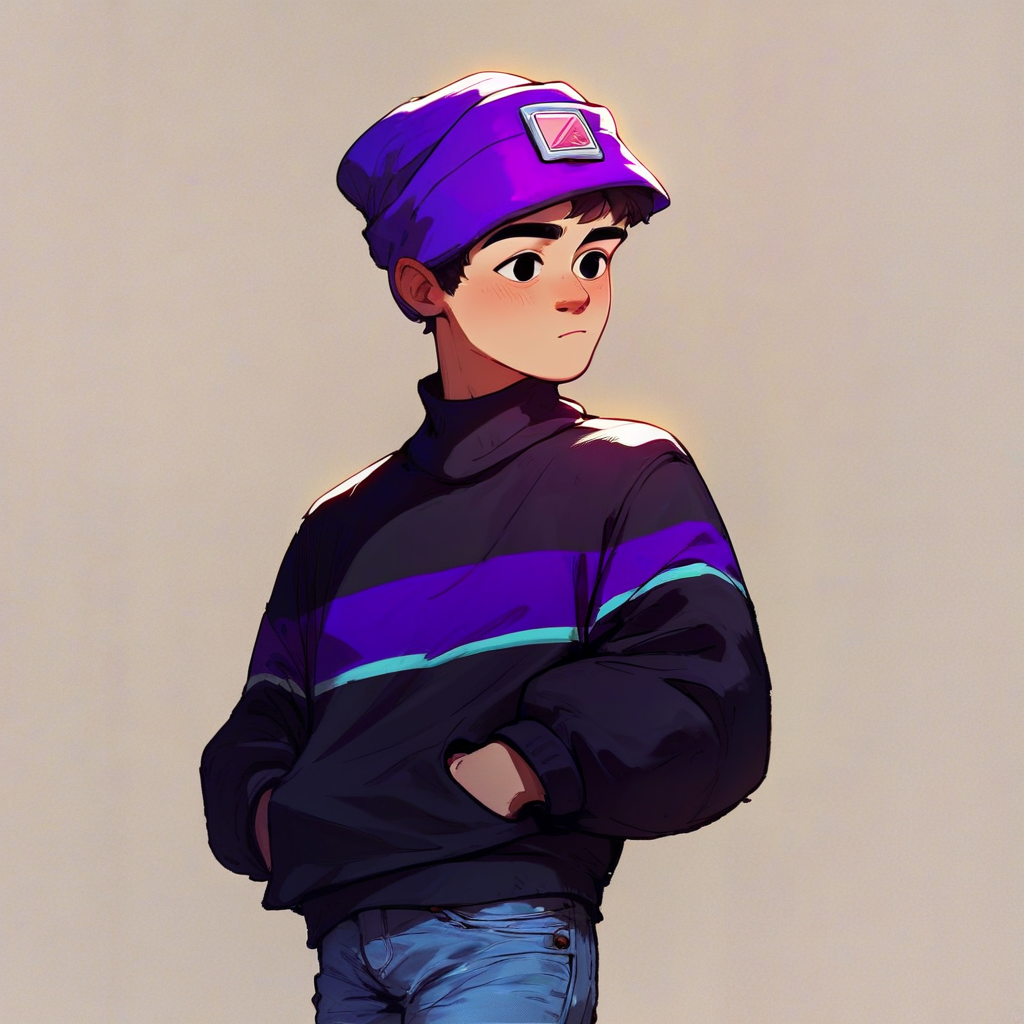 Lo-Fi, LoFi, lofi, 1boy, boy, black and purple striped sweater, light blue jeans, purple hat, black eyes, solo