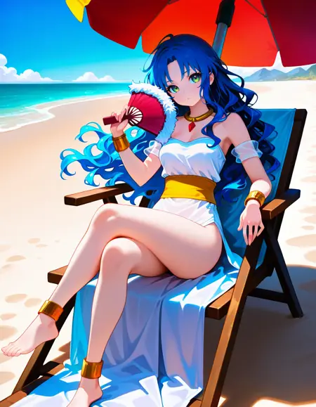 Recommended Prompts:white dress,blue hair, long hair, green eyes,necklace,anklet,bracelet,jewelry,large breasts, wavy hair,