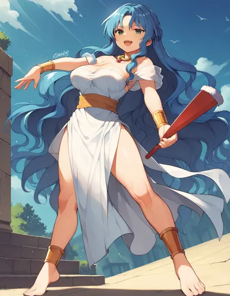 Prulue123, 1girl, 青髪, 波状の髪, 長髪, 緑の目, 裸足, ネックレス, アンクレット, ブレスレット, 白いドレス, 黄色いサッシュ, 肩出し, 裸足,