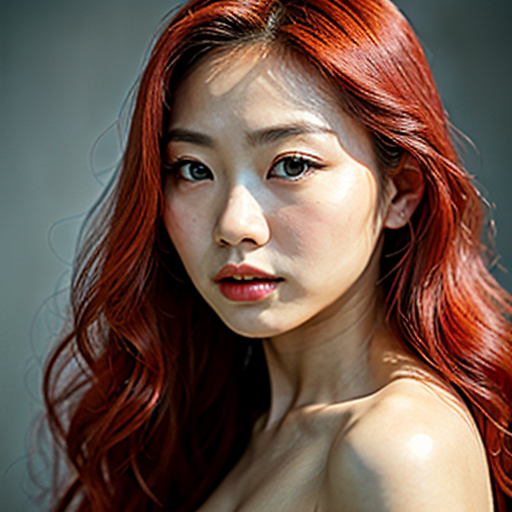 半分韓国人の女性、長い赤髪、リアルな美しいポートレートのポーズ