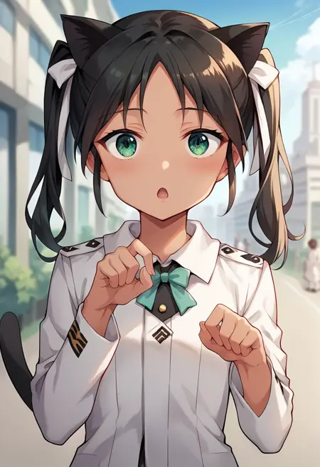 score_9, score_8_up, score_7_up, source_anime, masterpiece, 1girl, ctianfranc3sca, (tan:0.3), white uniform, white ribbon, neck ribbon, facing viewer, looking at viewer, outdoors, sunny, day, city, depth of field, striped panties,