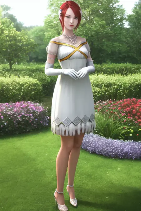 princesselise, red hair, short hair, blue eyes, white dress, white gloves, high heels, earring, feather ornament, necklace