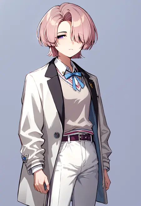 기본: arimura mao, hair over one eye, 오픈 재킷, 흰 바지, 분홍 로퍼