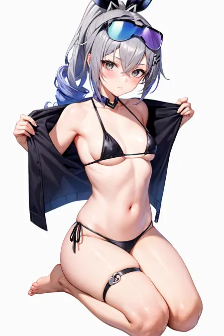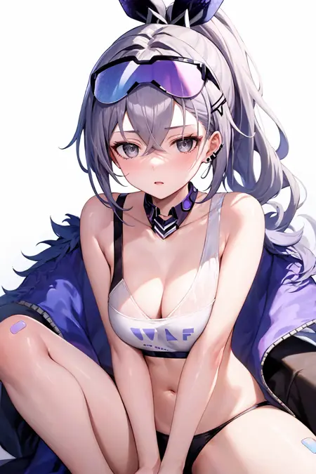 tag:silver wolf (honkai: star rail),1girl, solo, eyewear on head,long hair,grey hair,hair ribbon,ponytail,earrings,grey eyes,black choker,jewelry,fur trim,fingerless gloves,crop top,black jacket,open jacket,bare shoulder,navel,belt,short shorts,black shorts,thigh strap,