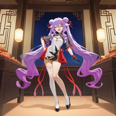 SirinQipao,双马尾,双白色发髻,白色发髻,发饰,红色裙子,黑色手套,短袖,黑色袖子,白色大腿袜,单侧大腿袜,