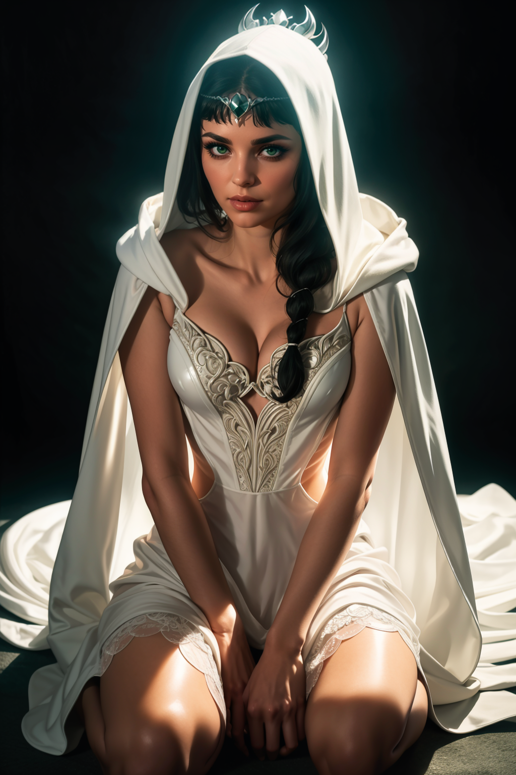 dr3ss, red dress, long dress, capelet, hood, form-fitting, collarbone, cleavage
