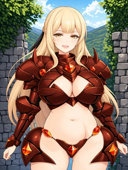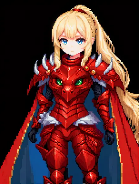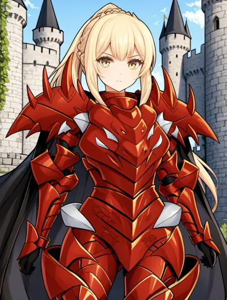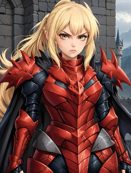 빨간 갑옷, 검은 망토, 어깨 스파이크, 용 갑옷, 용 머리