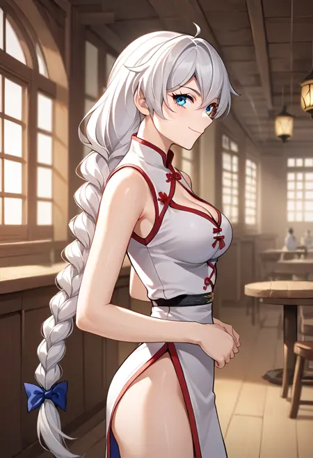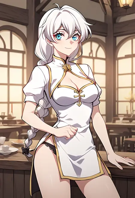 트리거 단어: kallen_kaslana, 땋은 단발, 긴 머리, 흰 머리, 파란 눈, 앞머리