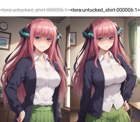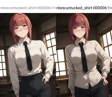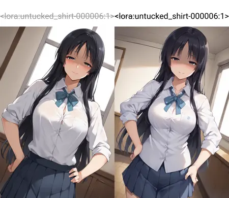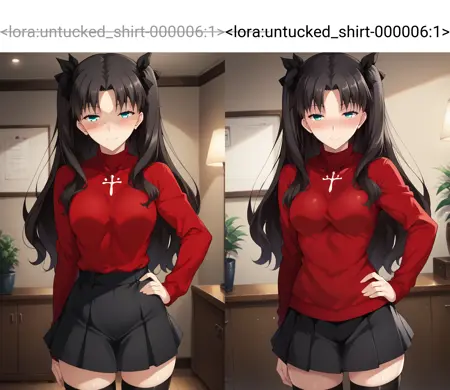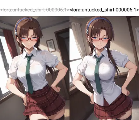 Pony XLを使用している際、Untucked Shirtのプロンプトが正しく機能しなかったため、個人用にLoRAを作成しました。もう共有するタイミングだと考えています。
