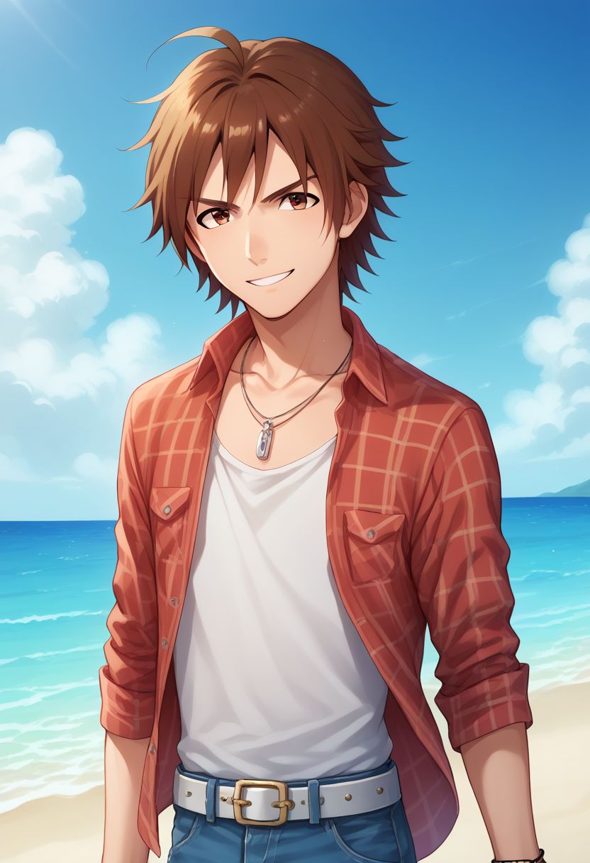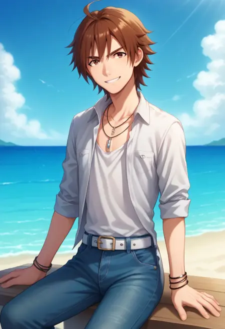 #2 - touma, 1boy, 男性焦点, 茶色の髪, 短髪, ahoge, 茶色の目, シャツ, ジュエリー, ベルト, ブレスレット, 空, ネックレス, パンツ, 開いた服, デニム
