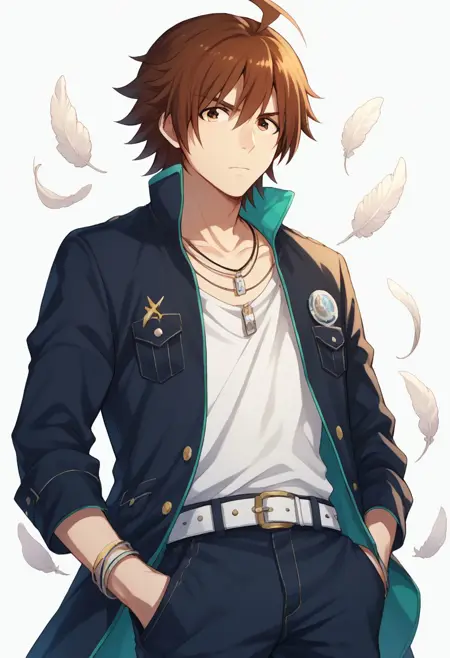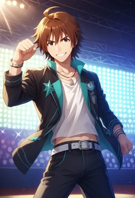 アイドル #2: amagtoum, 1boy, 男性焦点, solo, 茶色の目, 茶色の髪, ジュピター衣装, クラビック, ネックレス, 白いシャツ, 黒いジャケット, 開いたジャケット, 袖をまくった, 白いベルト, 黒いパンツ, ブーツ, 黒い靴