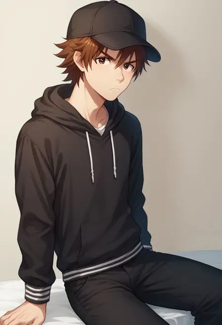 #3 - touma, solo, 茶色の髪, 短髪, ahoge, ジュエリー, 茶色の目, シャツ, 白いシャツ, 短袖, デニム, 靴